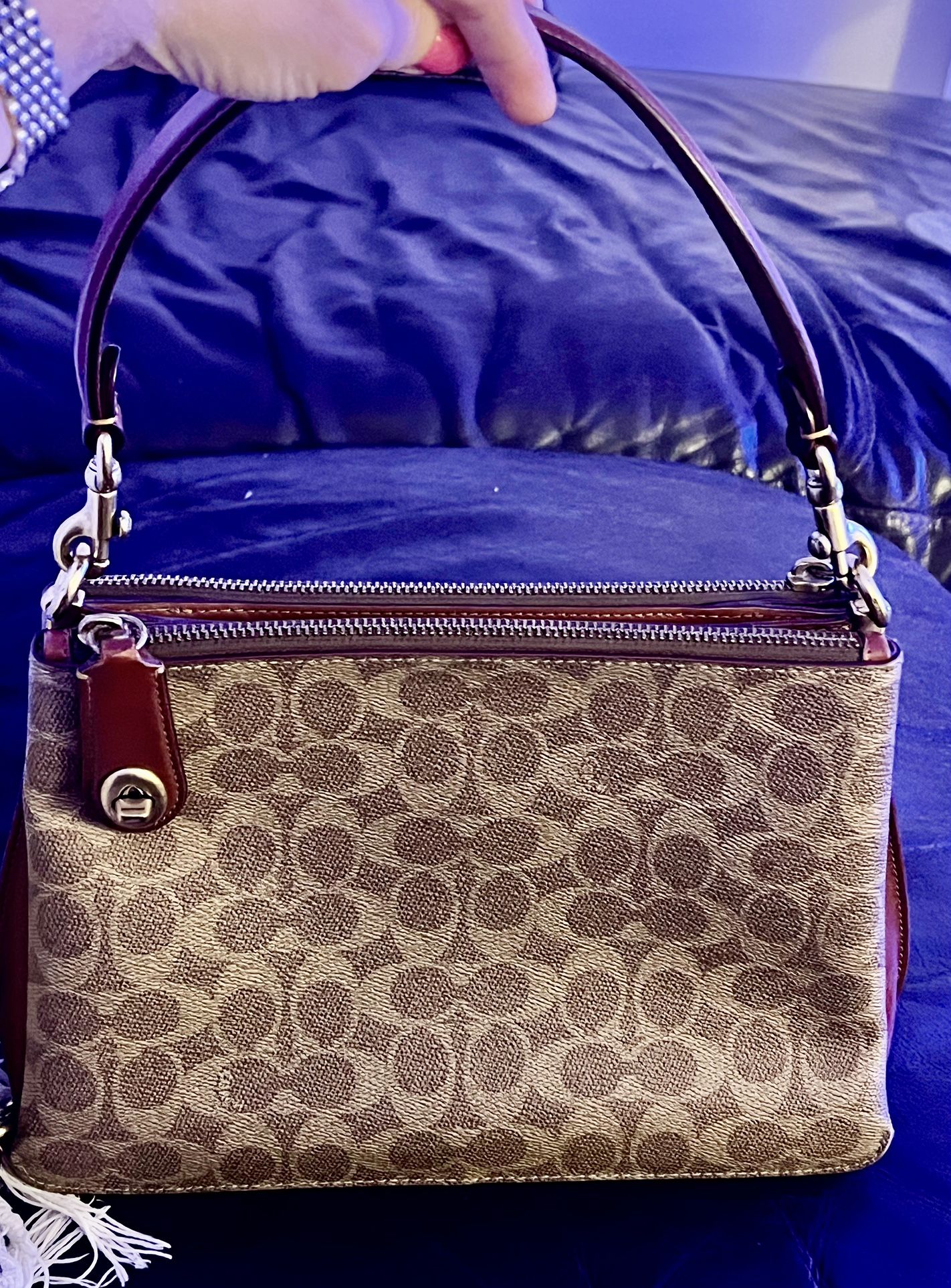 Brown/Tan authentic Coach leather purse With leather shoulder strap and leather handle. Approx 12x8 with two zippered exterior pockets and buttoned middle compartment with extra zippered pocked . Great condition Barely used