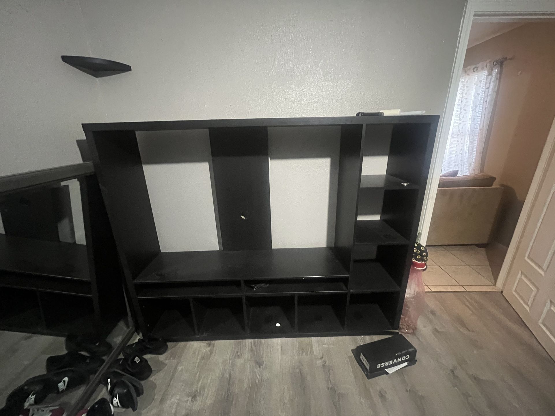 Cherry wood draws both for 80 $ Small black tv stand 20$ Entertainment center stand ( black ) 60$ Grey coffee table 20$
