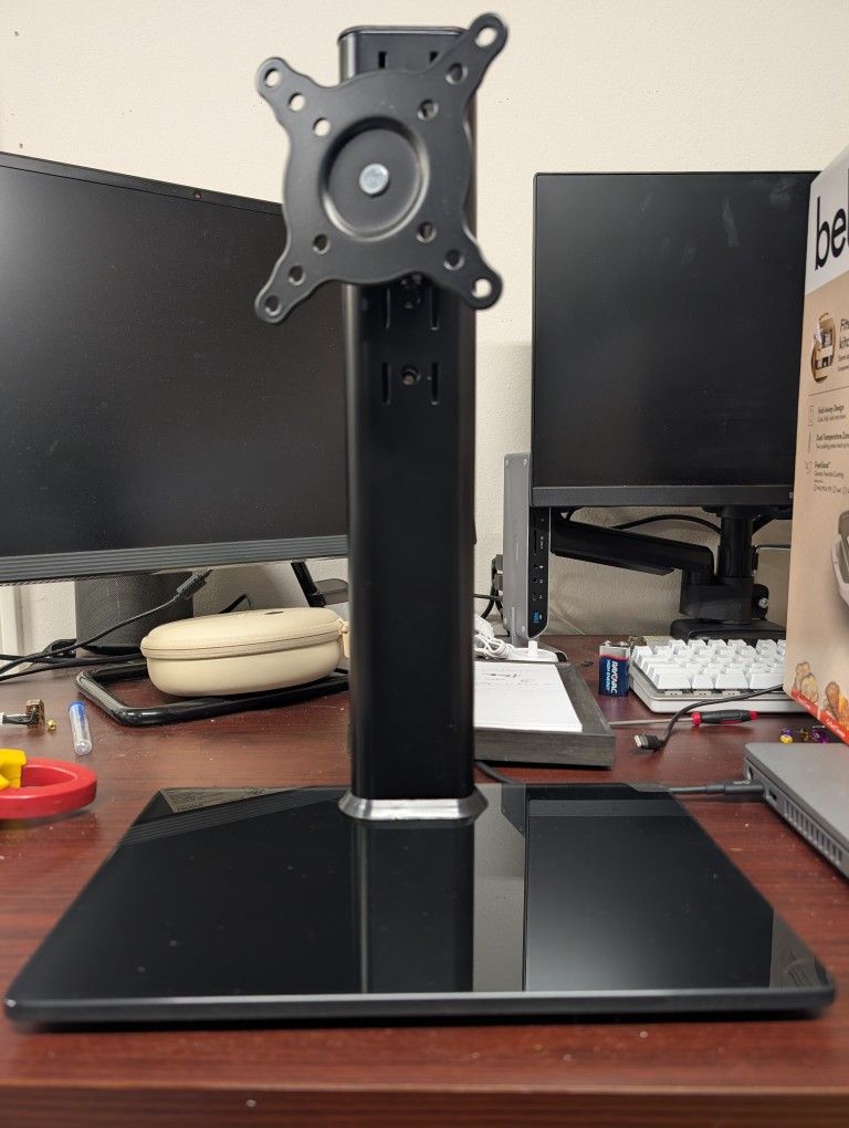Works great. Per Amazon listing, this holds up to 77 lbs and 13 to 32 inch monitors.