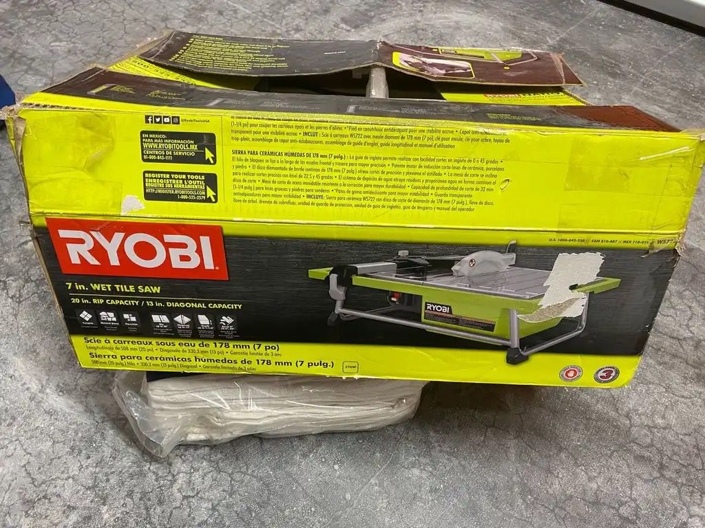 Used wet tile saw with original box and information booklet. Comes with a blade but should be replaced. The saw table is an all-in-one piece with its own stand.