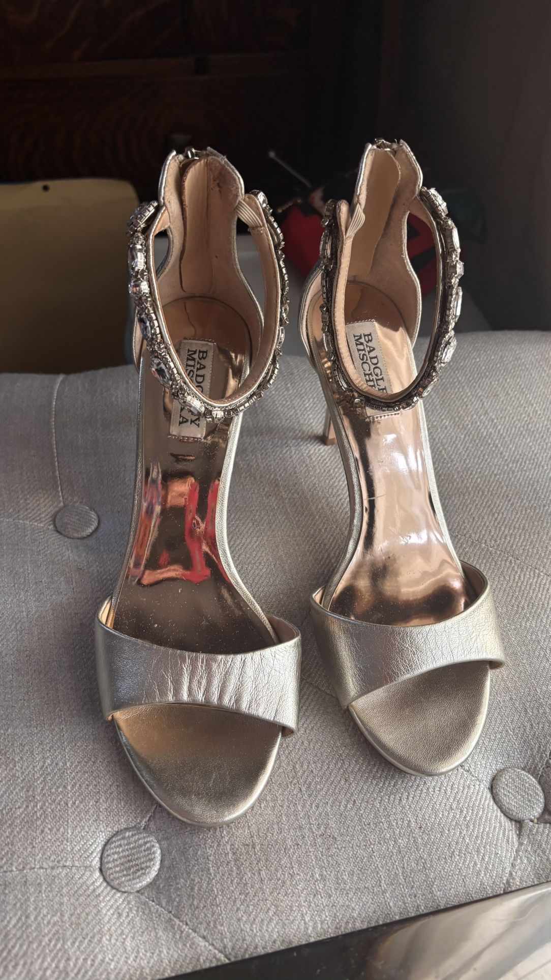 Badgley Mishka metallic heels peep toe pretty ankle straps size 8.5 zipper on back like new