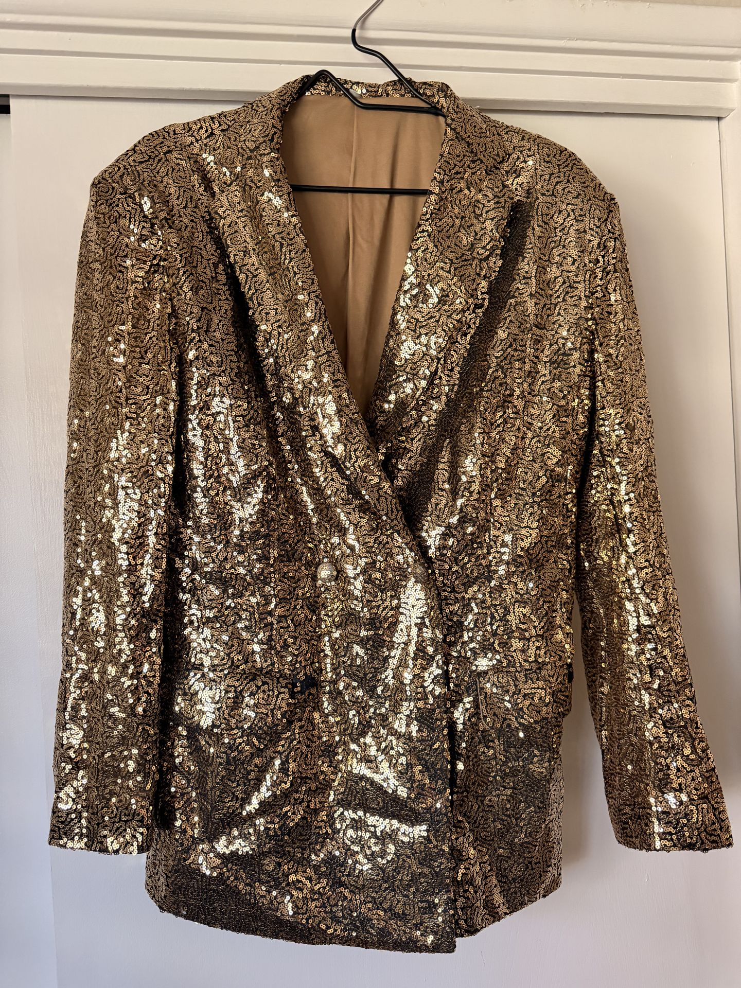 Gold sequins jacket, pants, light cover up and gold platform shoes