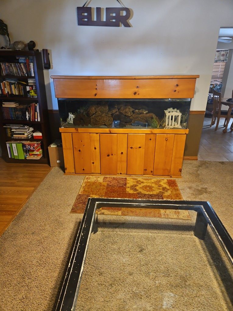 150 gallon tank, No decorations, rocks or fish. Tank, stand hood, pump and UV light. Bring a truck or trailer and a friend to help lift/carry it. Is full of water now to show it doesn't leak.
