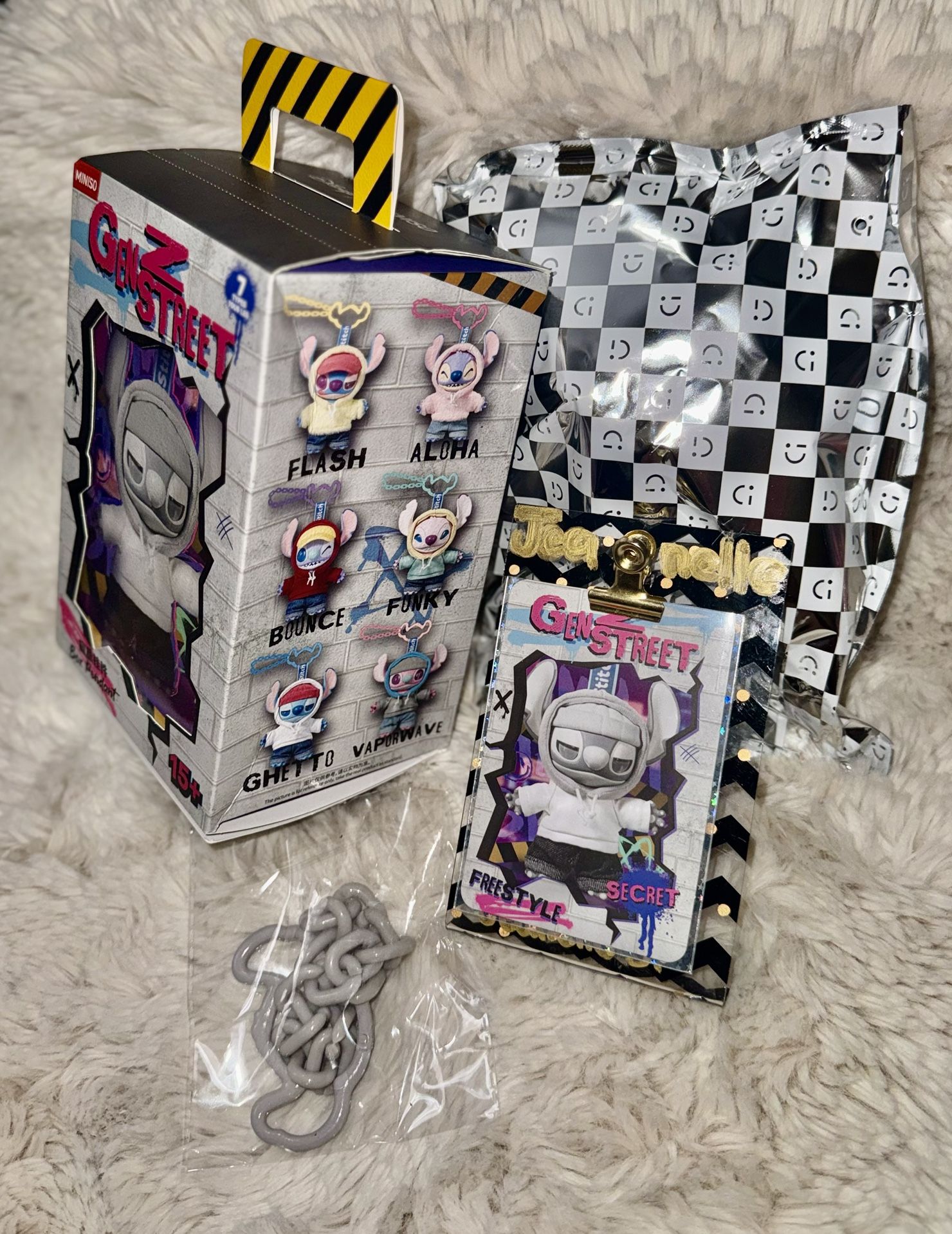 Authentic MINISO x Disney: Gen Z Street Stitch series- SECRET RARE Freestyle. This is from the original first made box of Gen z street with Ghetto Name on this special Series. They no longer produce this box so this is not only rare but super rare. I have only open the bottom to confirm and so item is still completely sealed and good as new . Can be resealed if needing it to be Given as gift. Will come with Plush, card, chain, and box. Message me for any inquiries and question . Bundle or send offer <3 Thank you