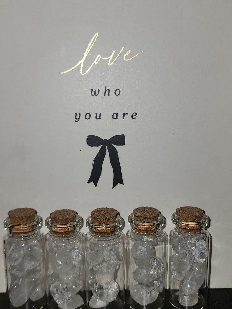 Beautiful clear quarts pieces in a cute bottle perfect for meditation or decoration! $5 per bottle