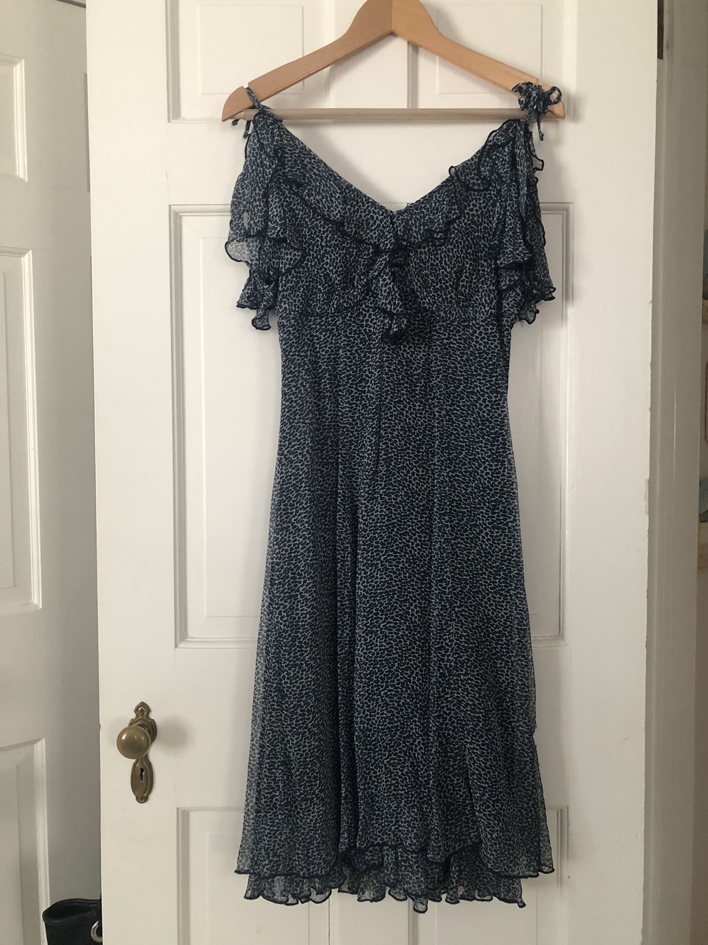 Elegant blue dress with ruffle details. V-neck front/back, tie straps (adjustable), back zip, button close. I bought this dress when I first moved to Belgrade as a Diplomat for diplomatic events, receptions, etc. It's perfect for any spring/summer occasion. Pair with a light sweater, jacket, blazer or wear alone. Size 38 = US 8. At the time I weighed 110-115 and it was very flattering. Drapes nicely. Despite the tag, I'd say it's closer to a US size 4-6, which is what I wore at the time. No tears/holes. "Viscose is a great option if you're looking for a lightweight material with a nice drape, a lustrous finish, and a soft feel. A breathable material, which makes it ideal for summer clothing." Knee length. Only worn maybe 3x, though I still love it! Contactless payment using Zelle, Venmo only. Cash acceptable as well