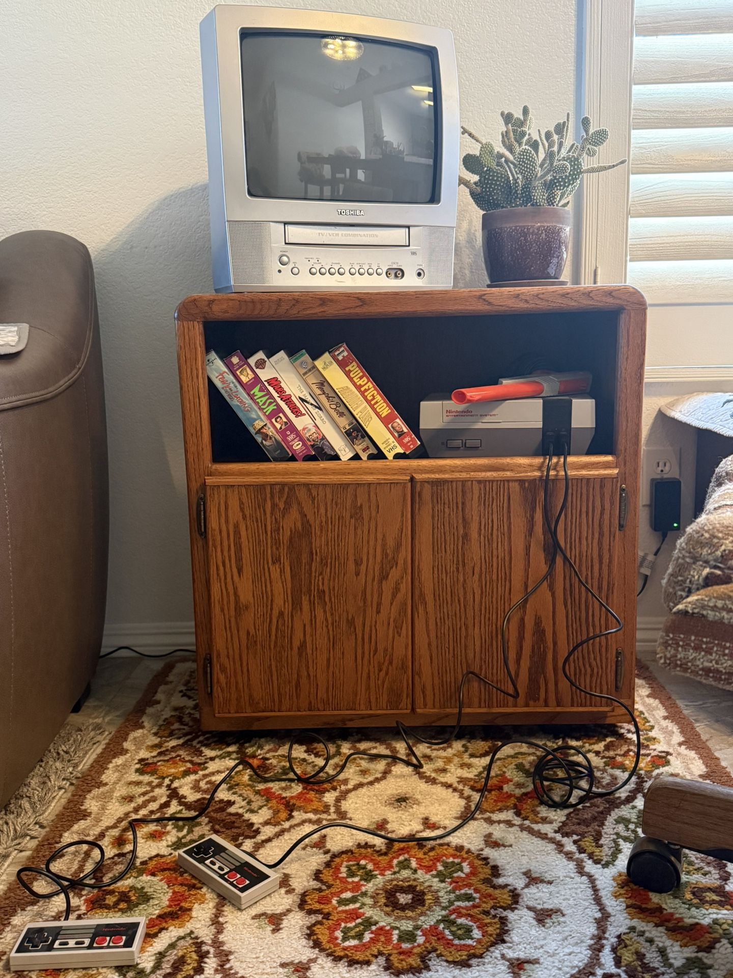 Sturdy vintage solid oak media stand featuring a warm, natural oak grain and a clean, timeless design. This piece includes an open upper shelf perfect for electronics, books, or display, and a lower cabinet with double doors for hidden storage. Built from solid oak with rounded edges and thick panels, this stand has the weight and quality you only get from older furniture. Ideal for a TV stand, game console setup, or even as a low credenza in a living room or bedroom. Shows light cosmetic wear consistent with age, but overall very clean and structurally solid. I can deliver for a fee.