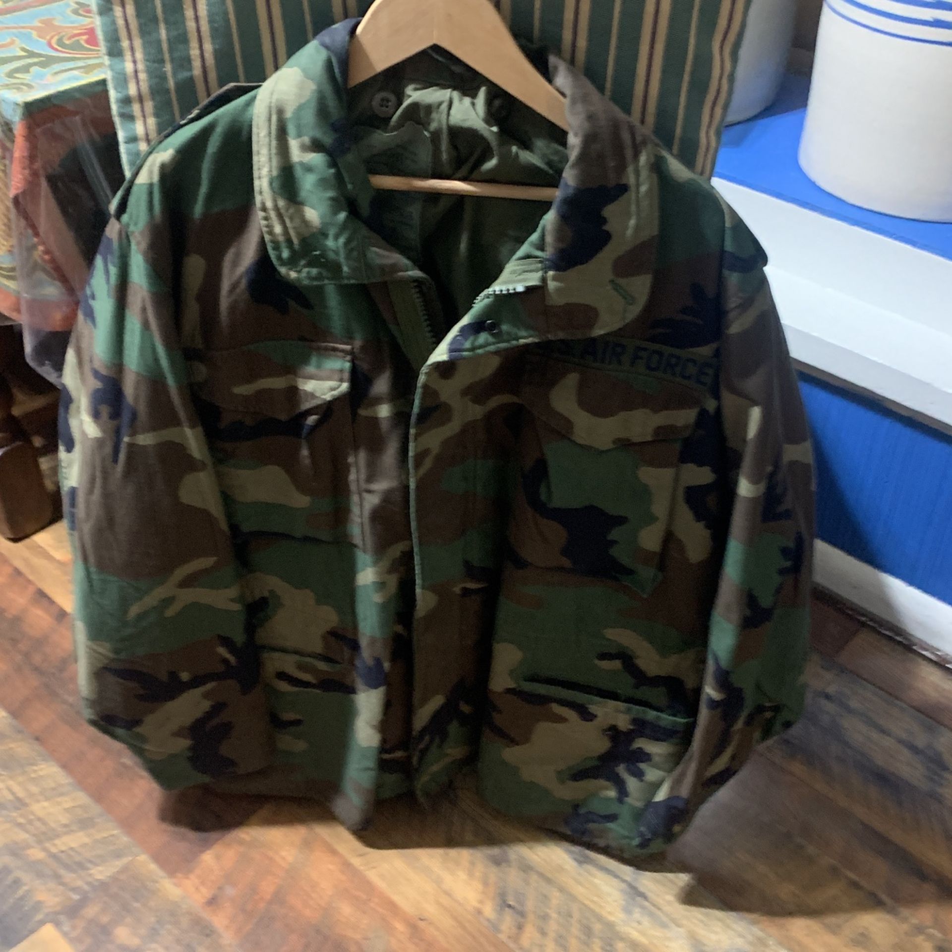 Military issued field jacket (Air Force) coat is in excellent condition, very heavy it also has a hood. It’s a oversized large , zipper works great