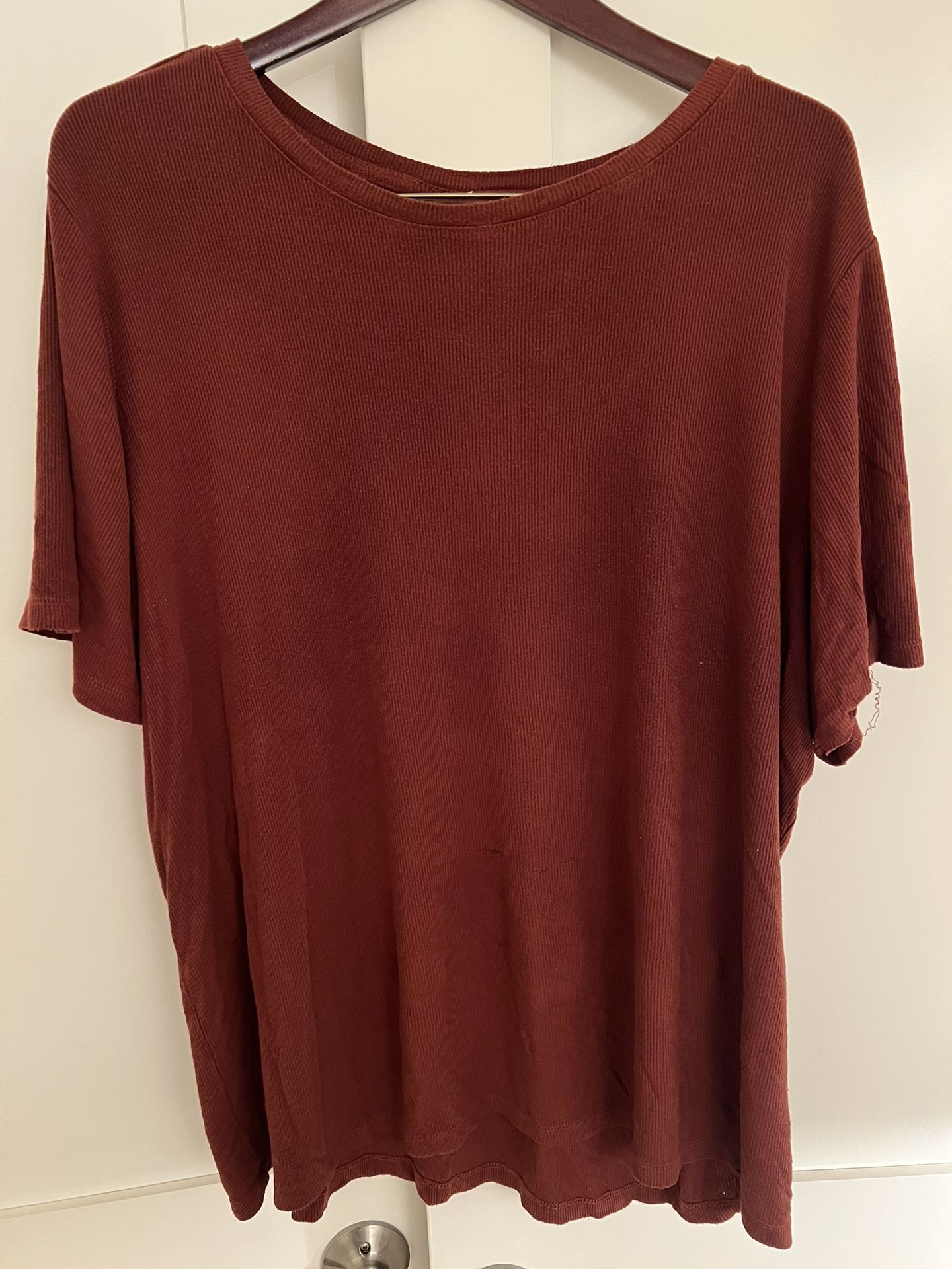 Gently used rust-colored sweater, size 2X, made by Ava & Viv. Has a ribbed texture and a relaxed fit.