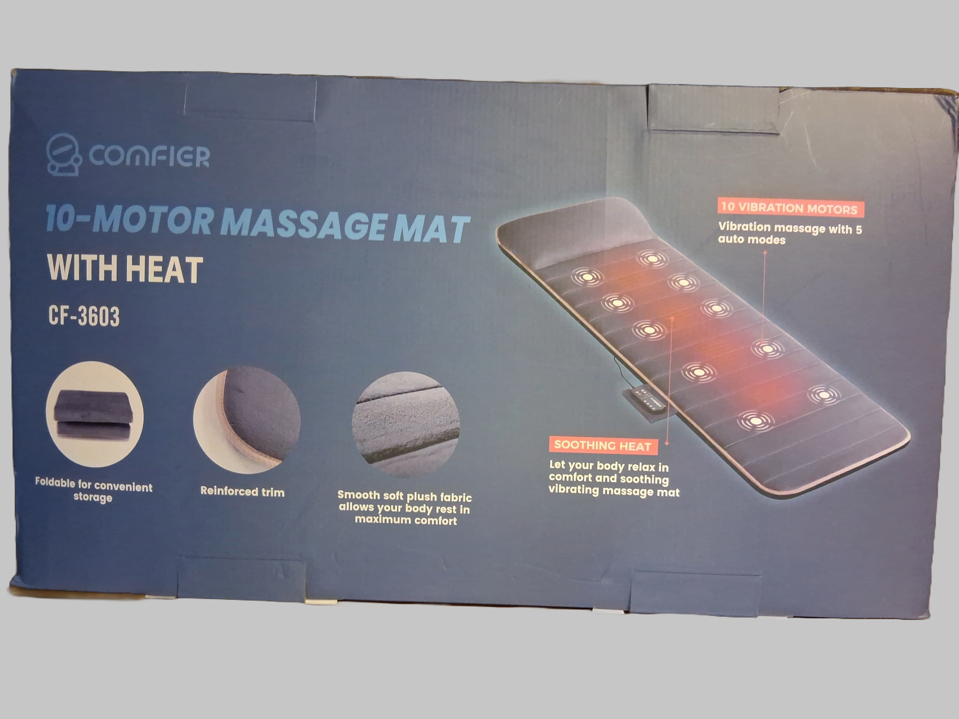 New in box never used Comfier Massage Mat with heat. • 10 Vibrati6 motors for fully body massage, • Smooth heat function for relaxation • Equipped with a auto-massage modes, • Foldable design, plush fabric for easy storage and comfort.