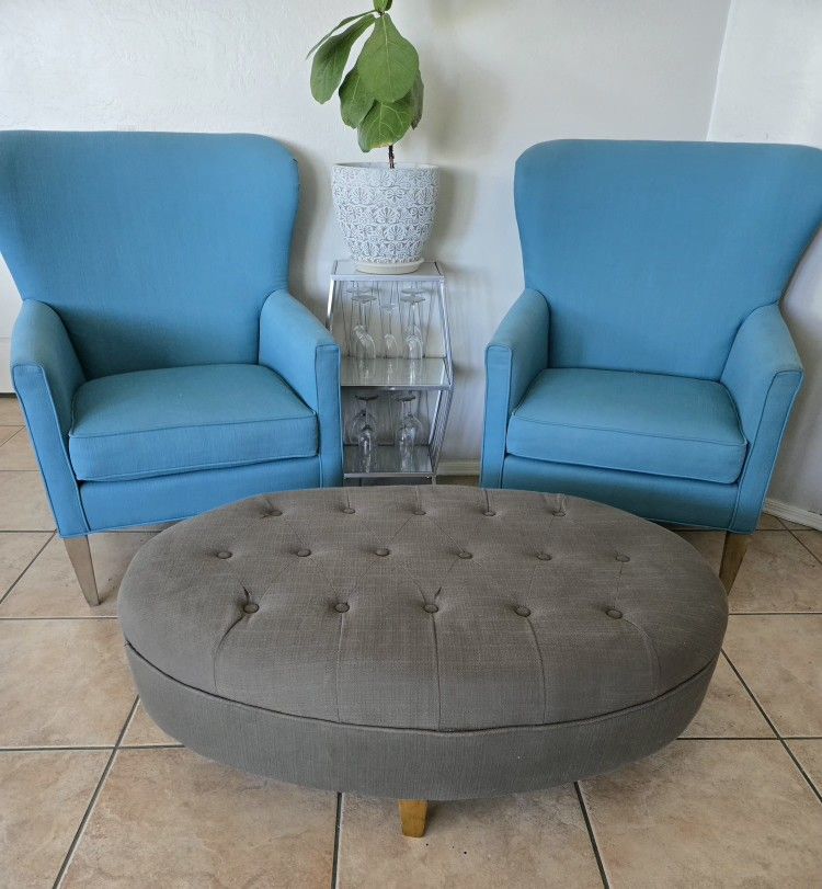 Tufted oval ottoman that is a gray/pewter color. The ottoman was rarely used and free of any rips or stains. Retails for $199 at At Home, asking $40. Dimensions: 44.5"W x 29"D x 16.5"H