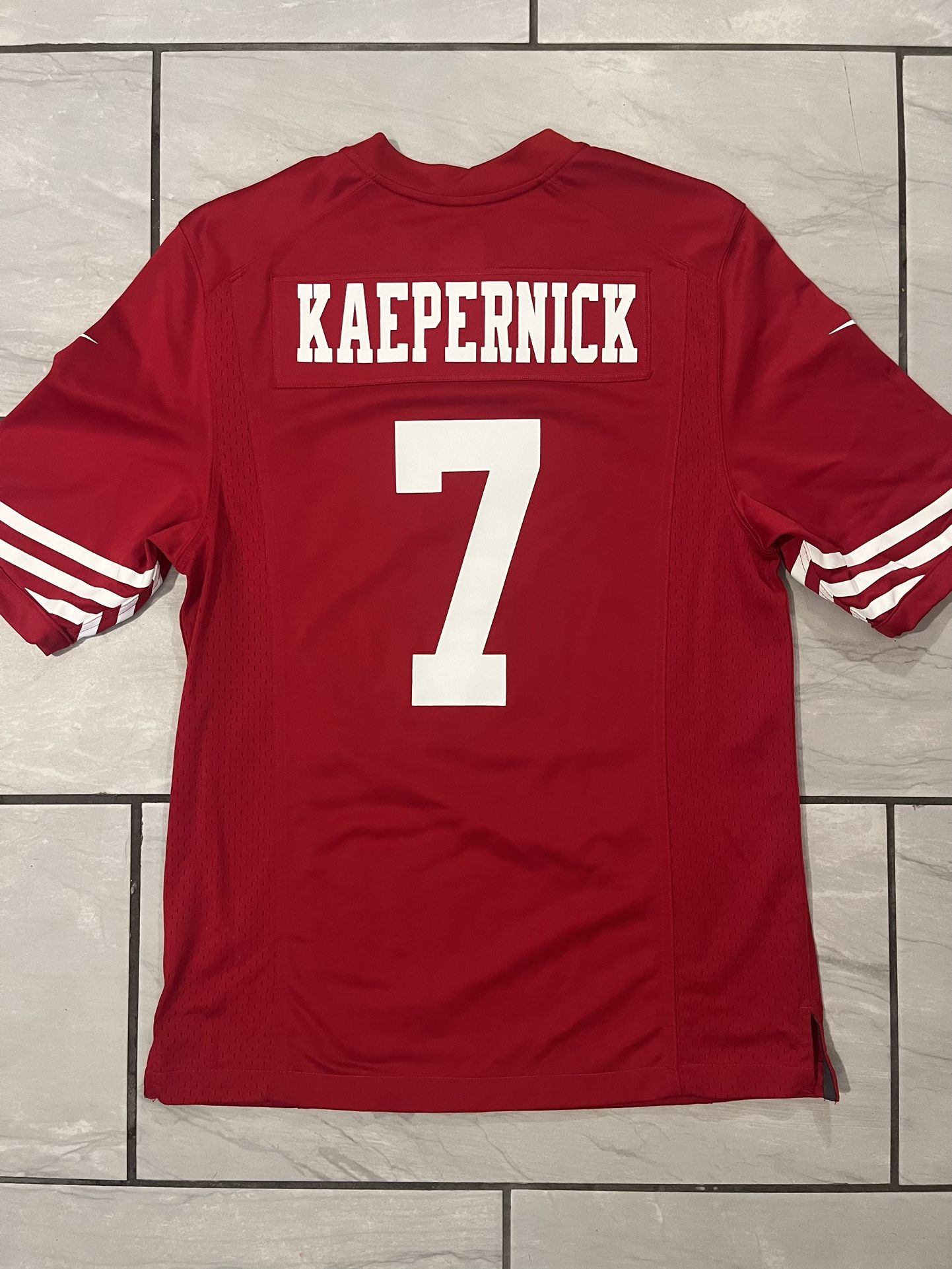 Excellent flawless condition size small men’s nfL Colin Kaepernick #7 Home red jersey. 100% authentic Nike. Printed on. Measurements: 21” x 30” Shipped 1-2 days after purchase. Show your support for the San Francisco 49ers with this Colin Kaepernick jersey from Nike. This officially licensed NFL product is perfect for football fans who want to show their love for the team. The red jersey is made for men and comes in size small, making it a great fit for those who want a comfortable and stylish way to show their support. The jersey features the 49ers' logo and Kaepernick's name on the back, making it a must-have for any true fan. Whether you're going to the game or just want to show off your team spirit, this jersey is perfect for you. Get your hands on this high-quality Nike jersey today and show your support for the San Francisco 49ers!
