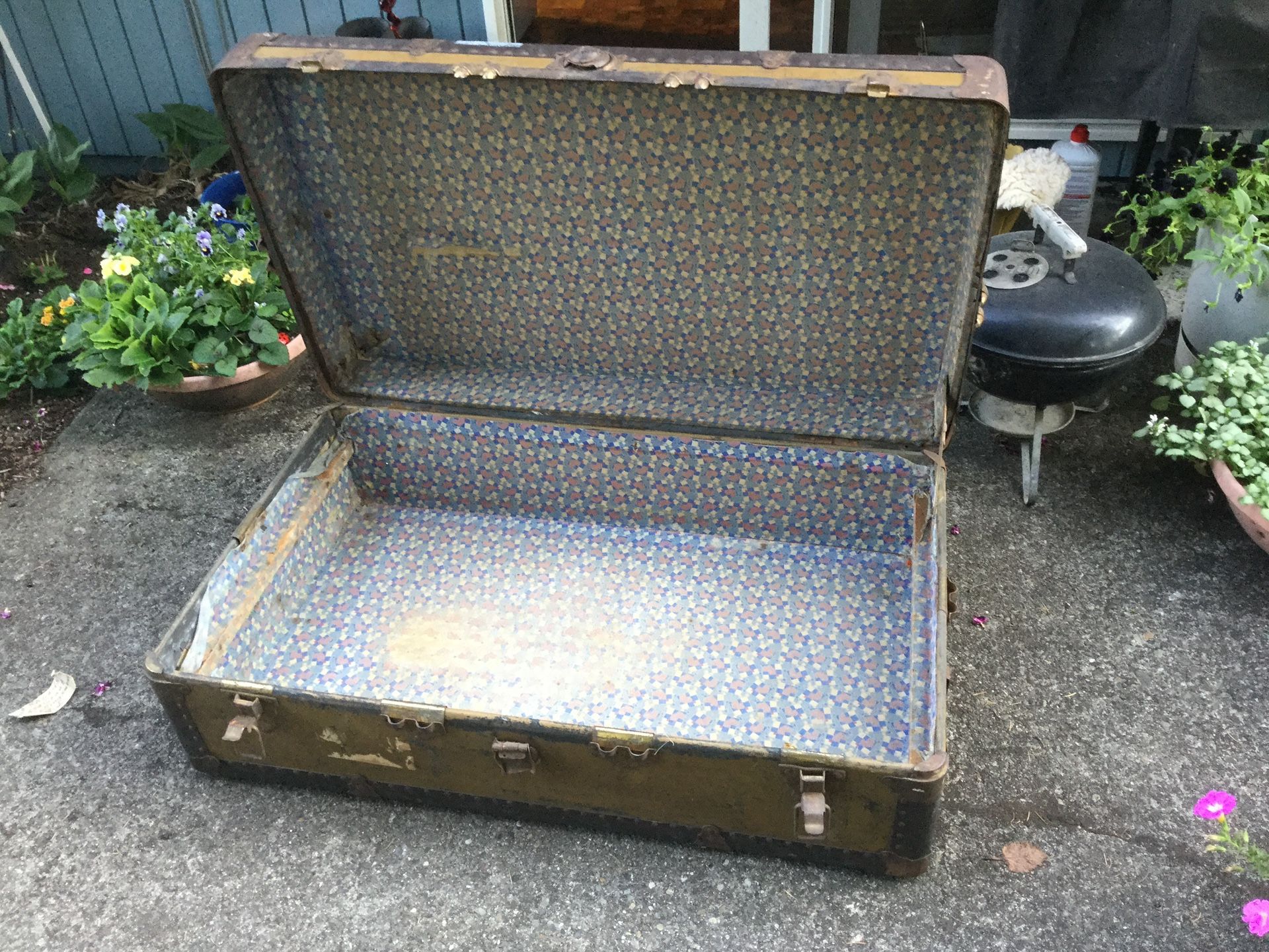 This was my Grandmother’s trunk in the early 1900’s- it could even be older. It is wood with fabric lining and metal clasps. I used it to bring my belongings to the Northwest in 1969; been using it for a TV stand, but was given a piece of furniture instead, so really don’t have room to store it any more. Size 39” long, 24” wide, and 12” high.