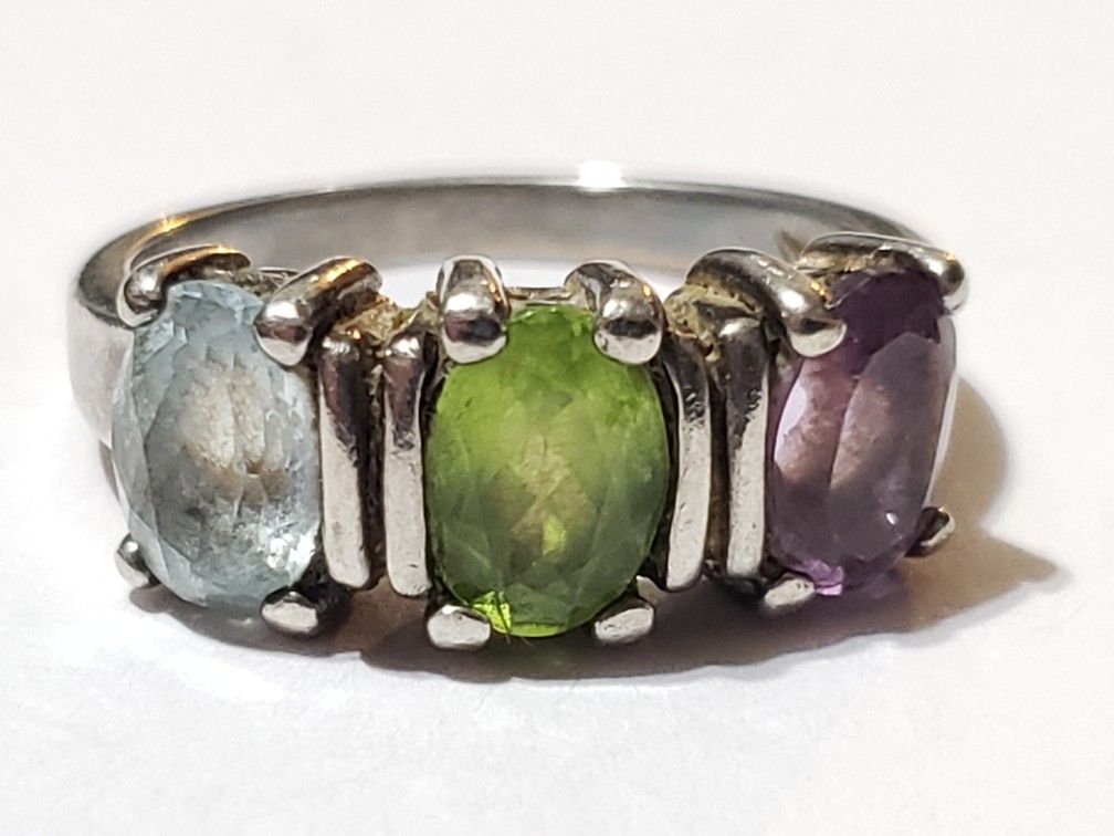 Beautiful sterling silver multi stone ring for sale. Size 7 Green stone tests as an emerald Purple stone tests as an amethyst Blue stone tests as a Topaz Stamped 925