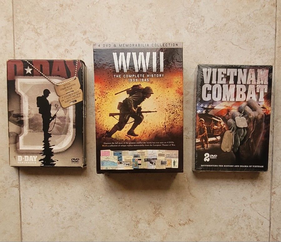 Selling the following DVD sets as a lot of 3. Price is for everything in the pics. Total of 10 discs. All are in like new condition. Vietnam set still sealed. •WW2 The Complete History Memorabilia Collection4 DVD • D-Day Commemorative Edition 2 Disc Set •Vietnam: The History And Drama 2 Disc Set