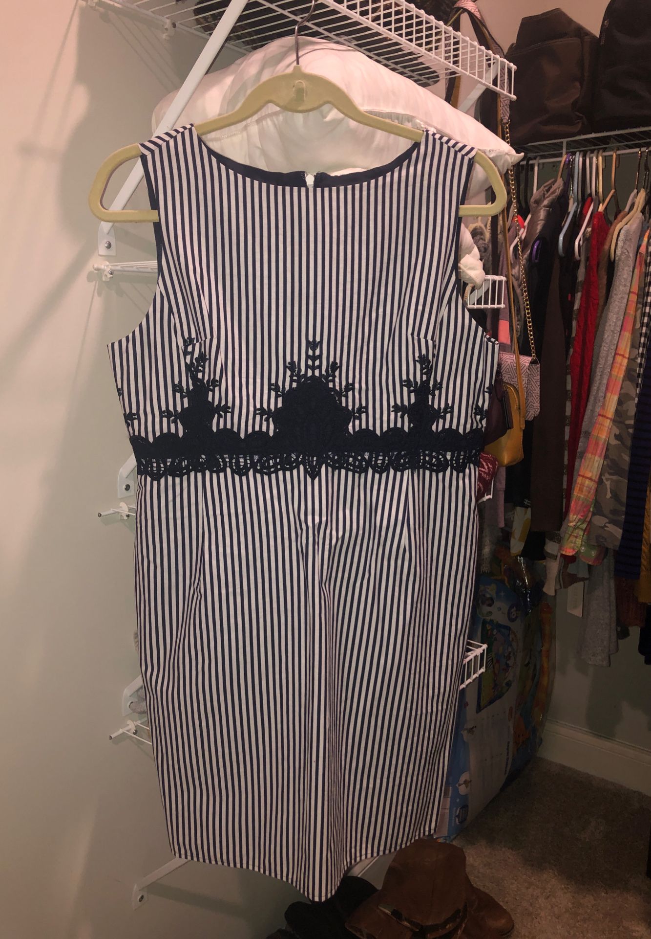Belk Cocktail/office attire dress, navy blue embellishment and navy blue stripes. Size 6P
