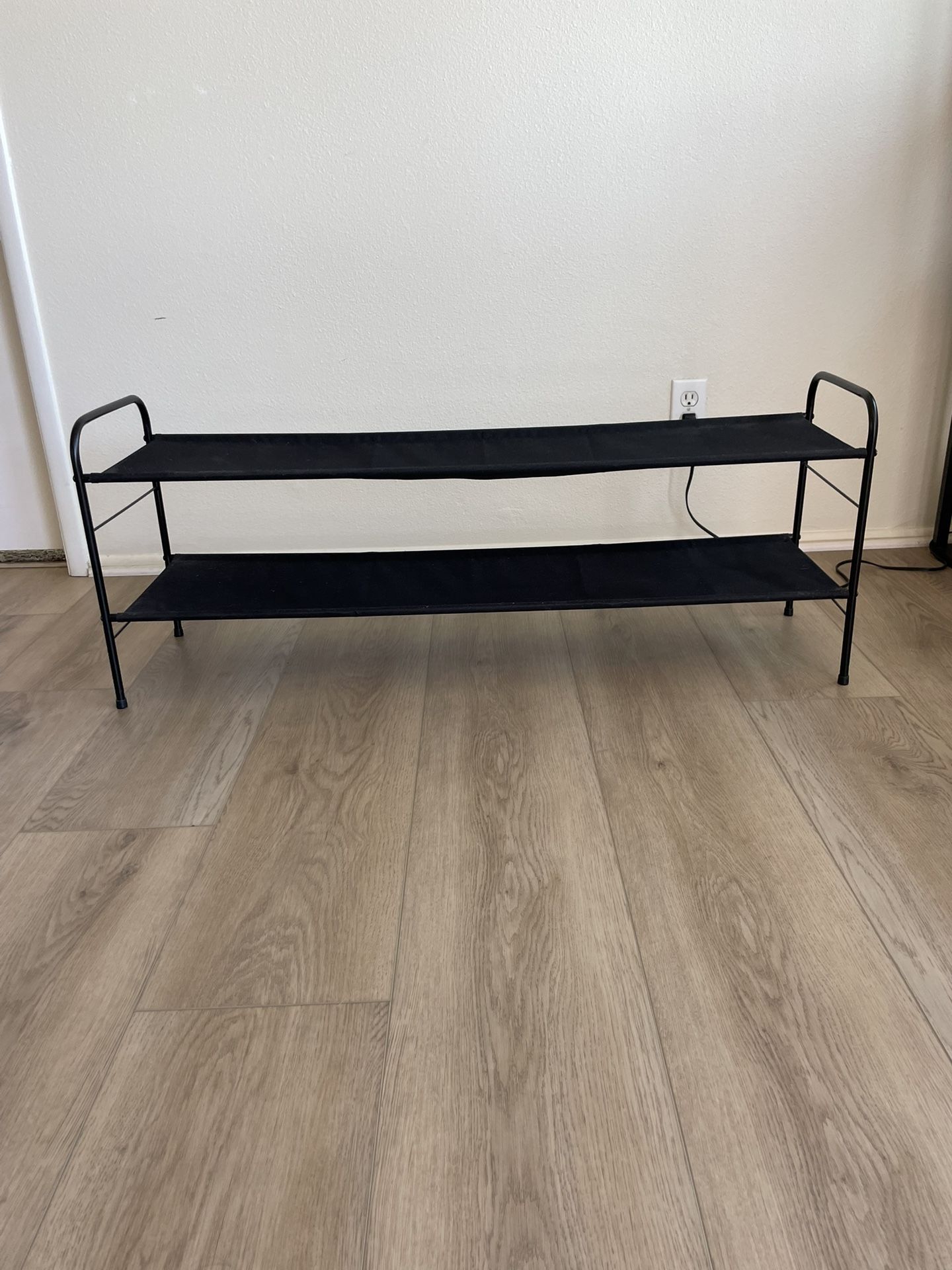 Black canvas shoe rack / shoe organizer. Fits ~10 pairs of shoes (+room underneath). In great condition. Dimensions: 16.5” (H) x 42” (L) x 11” (D)