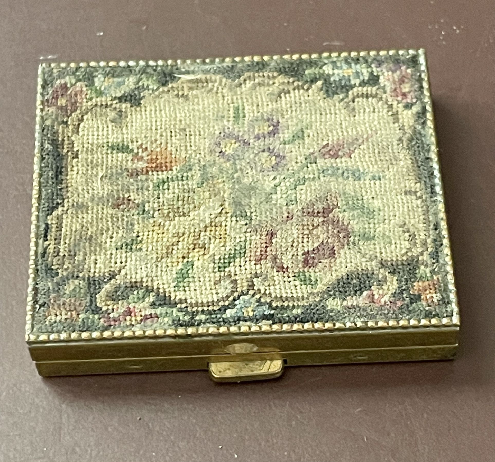 Vintage Schildkraut PetitPoint Floral Tapestry Needlepoint Powder & Mirror Brass Compact 1850 Stitches to the Square Inch. Genuine Handmade. Please see photos for additional description. Pet free - smoke free home. I ship fast!