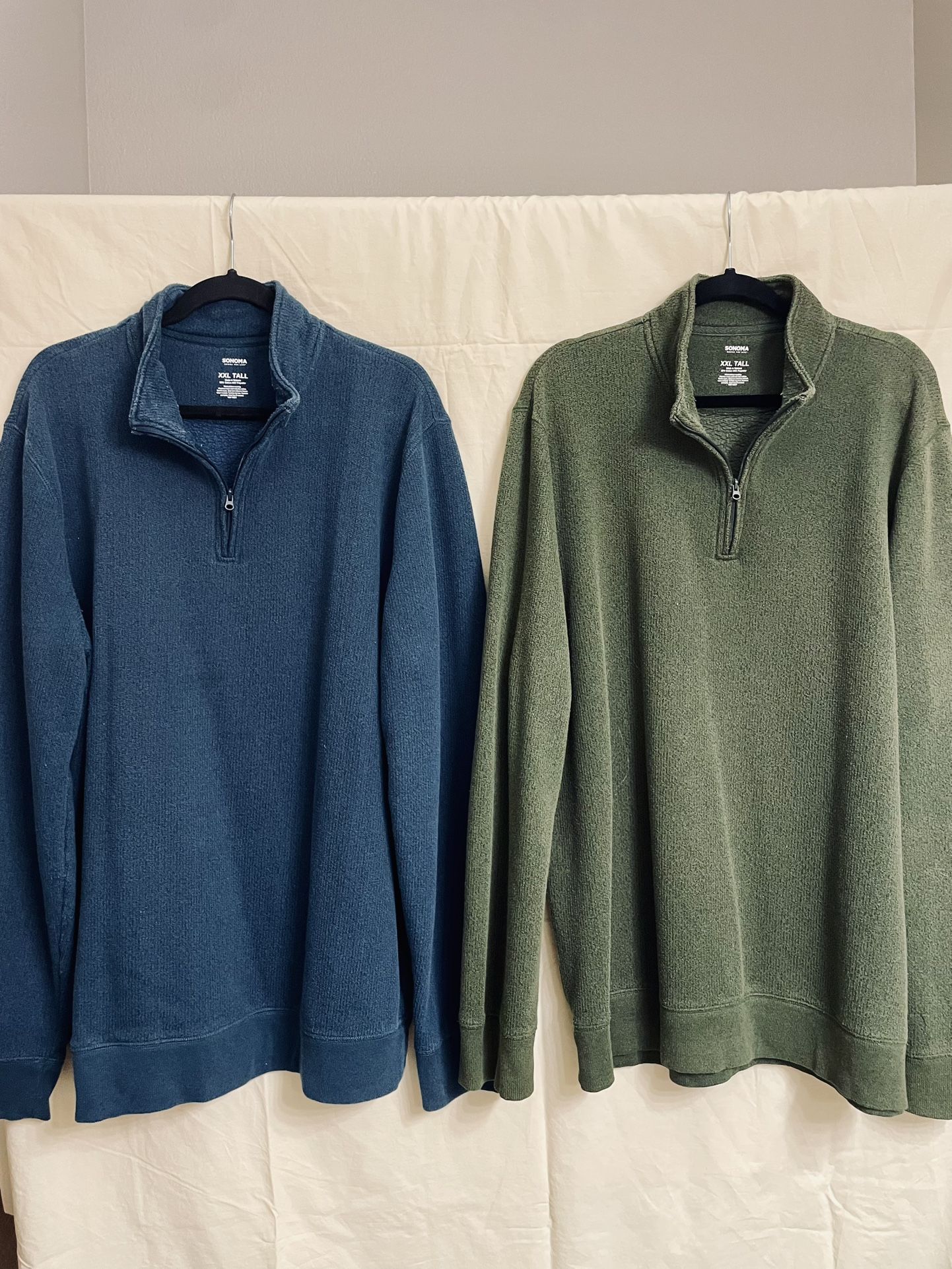 Men’s Sonoma quarter zip fleece pullovers size extra extra large tall includes two pullovers color, blue color green very comfortable warm and great for every day wear and act like condition no holes or stains. Smoke free home. $20.00 for both