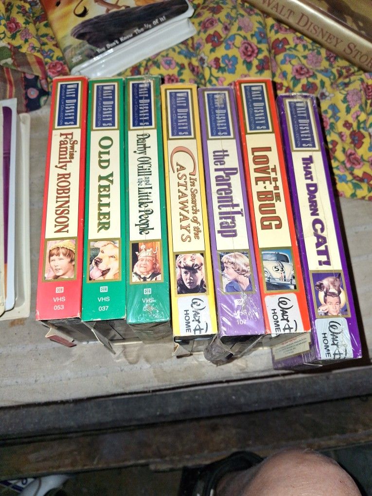 7 vhs tapes released by disney studios all live action. Titles are Swiss family Robinson, Old Yeller, Darby O'Reilly and the little people, in search of the castaway, the parent trap, the Love Bug and That darn cat.