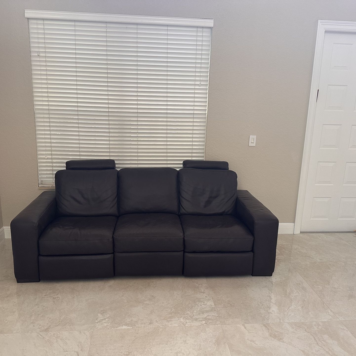For sale is one high grade/thick grain chocolate brown leather reclining sofa made by Natuzi in excellent condition. This is a manual pull recliner with adjustable back headrests in perfect working order. I hate to see it go, but it doesn’t match the new style of the room it was originally in. Originally purchased for $5k+. It’s a very heavy piece. You’ll need at least two people to lift and move it. It’s currently located on the first floor in a house and can easily clear through the front double doors when both opened. Measurements with reclining legs closed… Length: 90 inches Depth: 37 1/2 inches Arm Height: 22 1/2 inches About 35 1/3 high to headrest as pictured