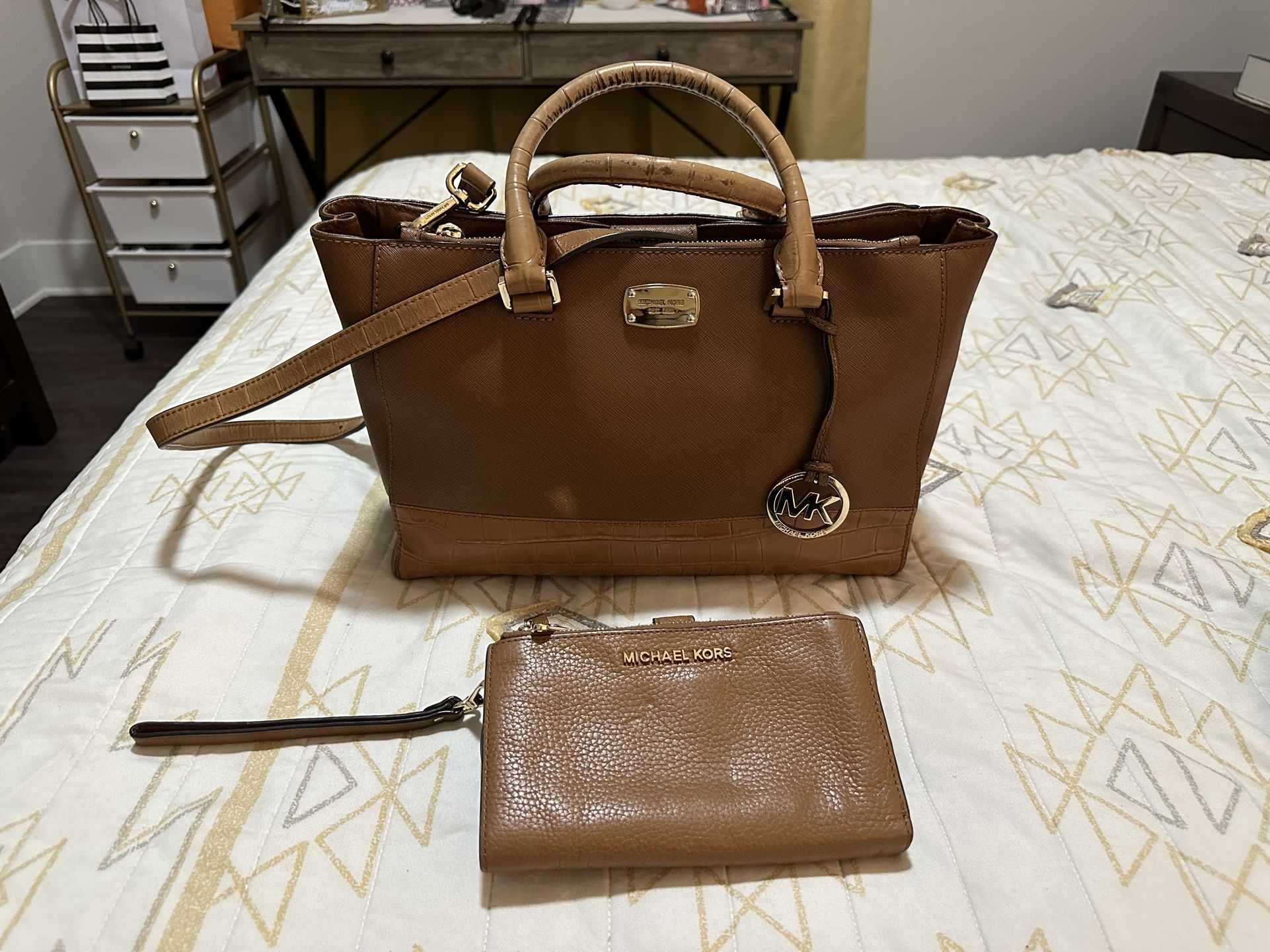 Original/used Michael Kors purse & wallet Color mocha brown. Purse with compartments inside. Shoulder strap. Wallet with compartments & ID & card holder & zipper side. Wrist holder.