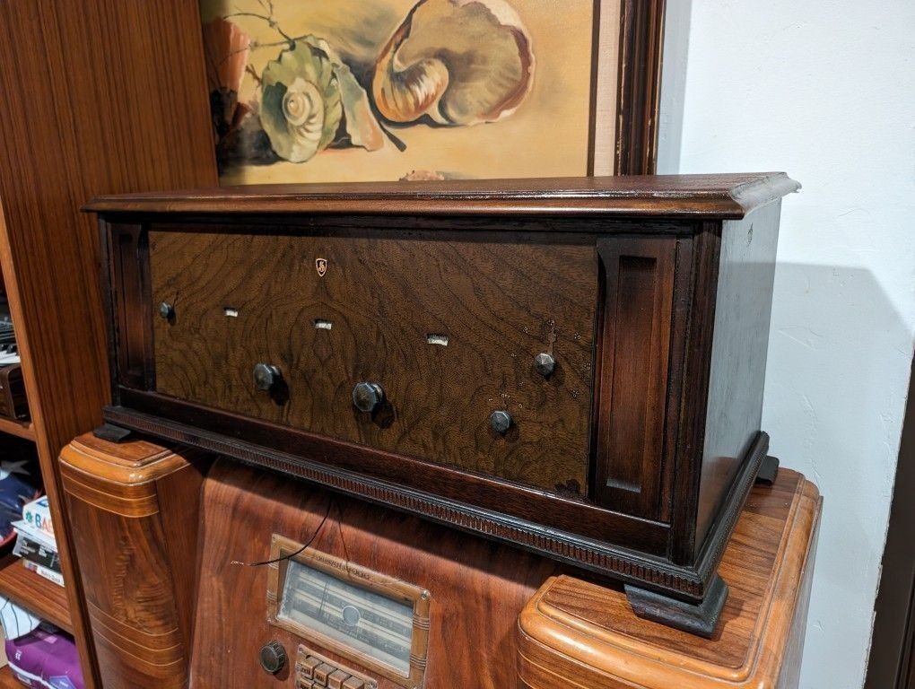 Untested but complete minus the tubes. Nice cabinet. The finish has some imperfections but good shape overall, especially for its age. 28x12x11d $55