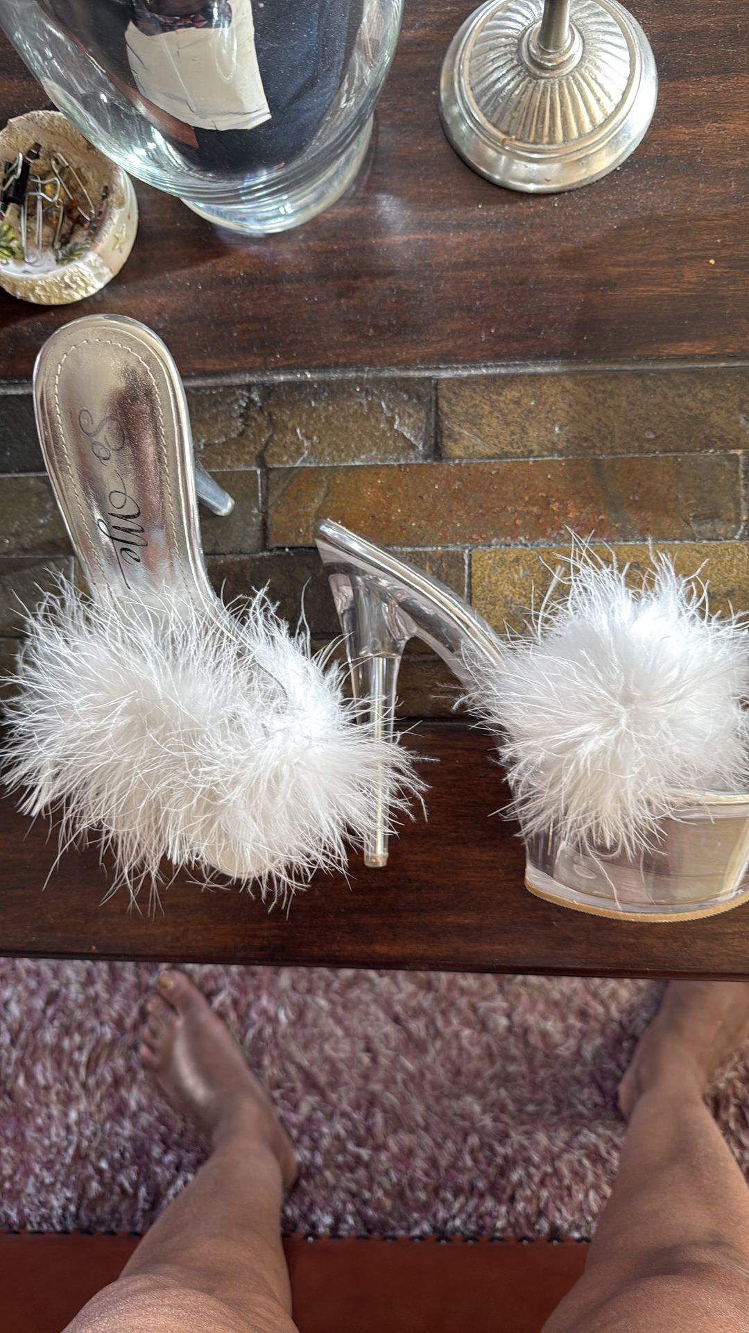 Color clear tall heel shoe with fur size 7 can for 7 1/2
