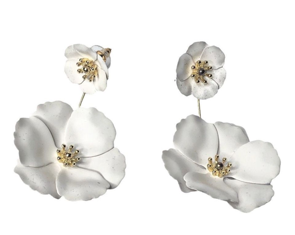 Metal Poppy Flower Dangle Earring- Matte Painted Dual Flower Floral Petal Tiered Drop for Women. SIZE & MATERIAL: 1.6”*2.5” , Weight:20g,Made of metal with 18k gold detailing,matte painted finish,with two attached 3D matte finished petals with Gold Flower Bud