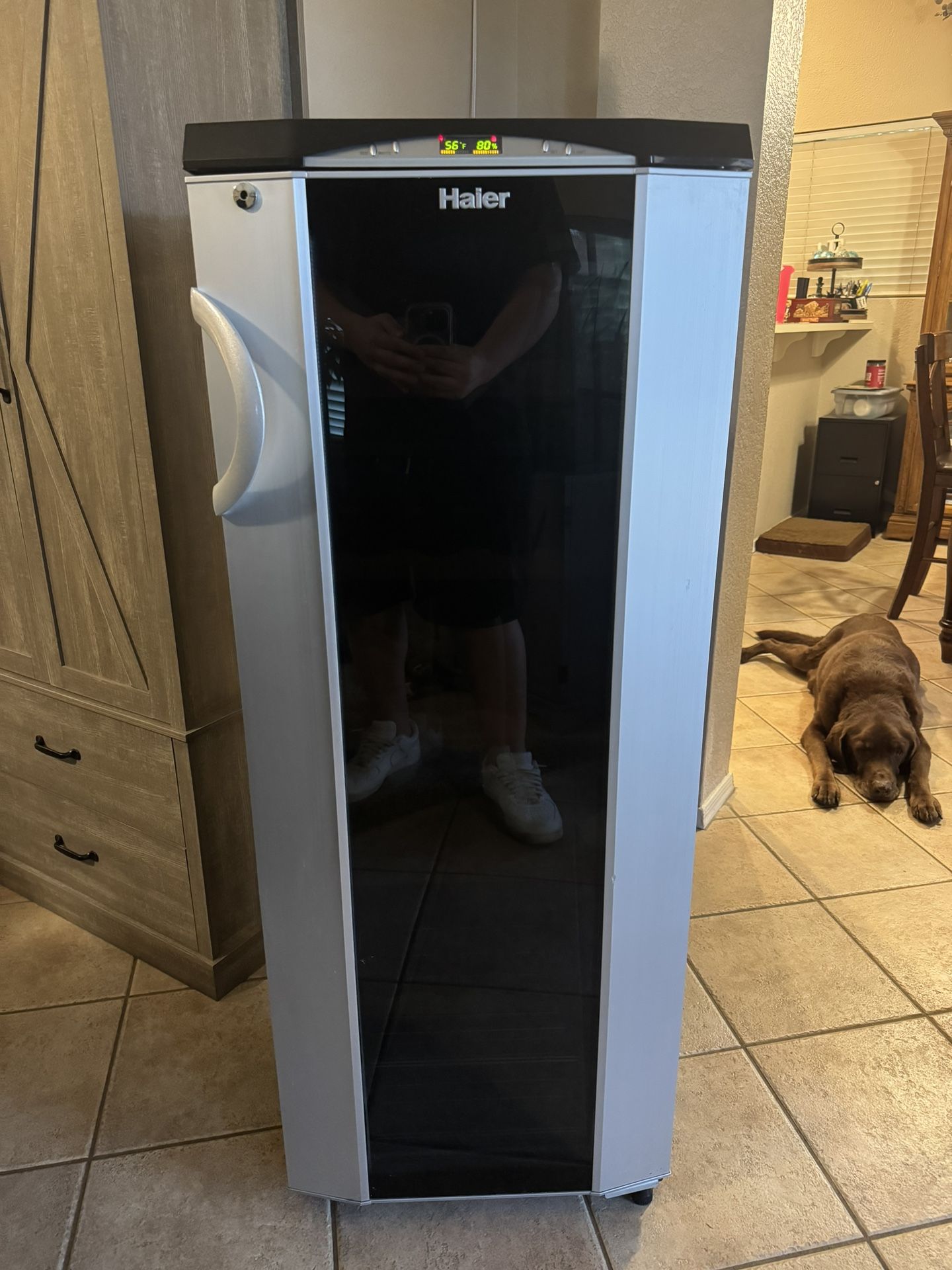 Preowned haier wine fridge Model- HVR049BLW Fridge can hold around 49 bottles and has 5.83Cu Ft of space Item works perfectly Item is H-51” W-20” D-21.5” Item does have some minor wear/scuffs but is overall in great shape 200$ obo