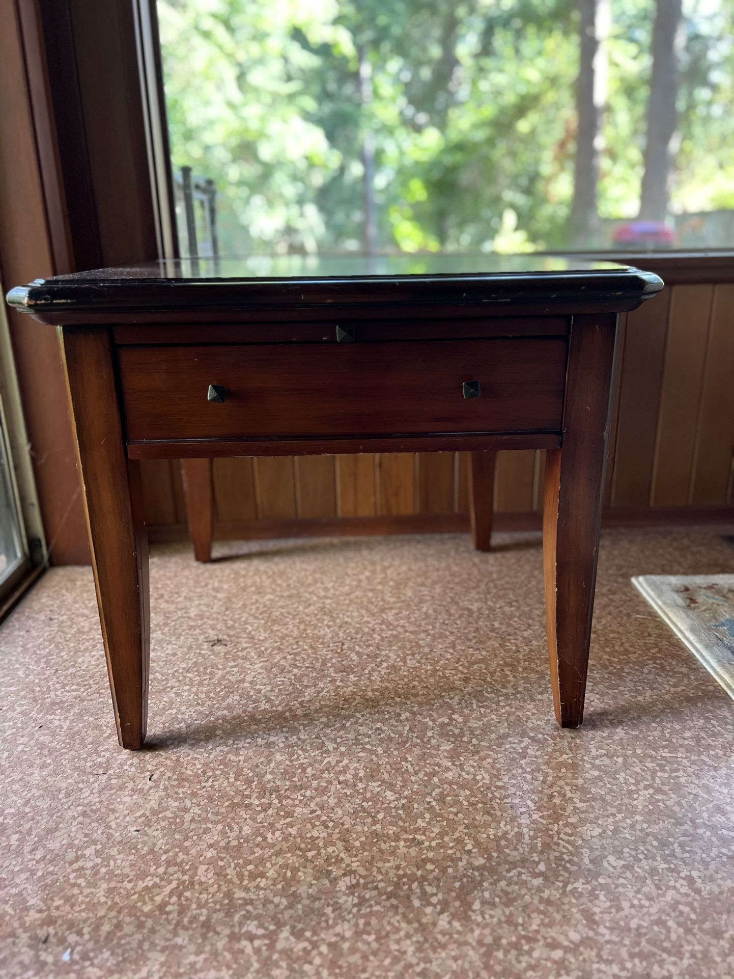 Hardwood side table with beautiful inlay pattern on the top. It’s a little scuffed in certain areas but still in great and usable condition