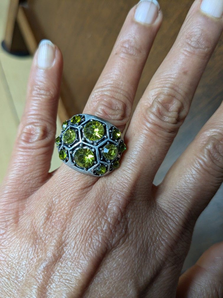 Vintage Antiqued Silver, Round Cut Peridot In Hexagon Setting Ring 1.25". Hand Wrought, OneSize Adjustable. Classy Elegance! The ring is meticulously designed and hand-wrought in an atelier in Los Angeles. The style combines an old world aesthetic with a modern edge The peridots have the perfect subtle sparkle, creating a ring with organic elegance that is both stunning and easy to wear