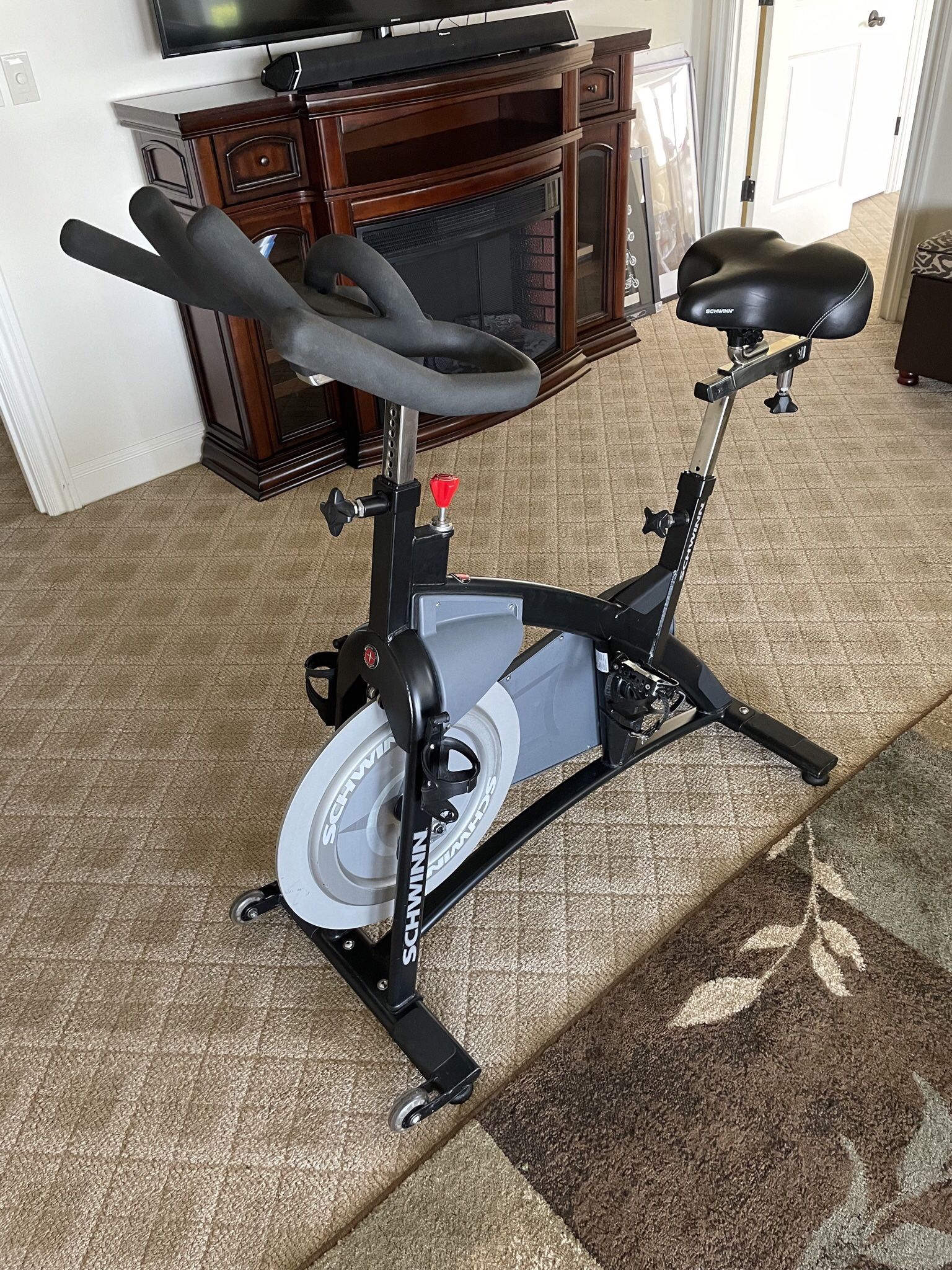 Schwinn A.C exercise bike. Seat and handle bars are adjustable to fit all heights. Comfortable seat and handle bars. Triple line pedals. Excellent condition.