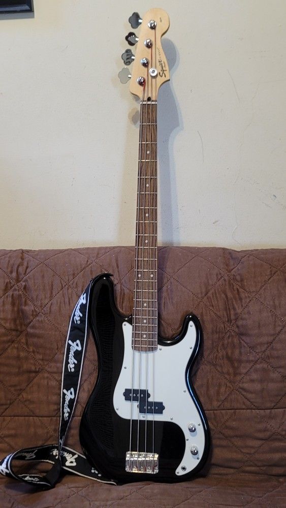 SQUIER P 4 STRINGS ELECTRIC BASS BY FENDER AFFINITY SERIES MADE IN INDONESIA IN BLACK COLOR. Bass is in excellent condition very well kept, used but not abused, this beautiful bass sounds amazing and clean, also he is really smooth and easy to play, if you are looking for a nice sounding bass to learn how to play, this is the one for you, the strings are still in excellent condition with a lot of life left, so bass is ready to show up on the stage, thanks for looking, fender strap is not included lol, you are getting bass only, thanks for looking (NO TRADES, NO SHIPPING SORRY)