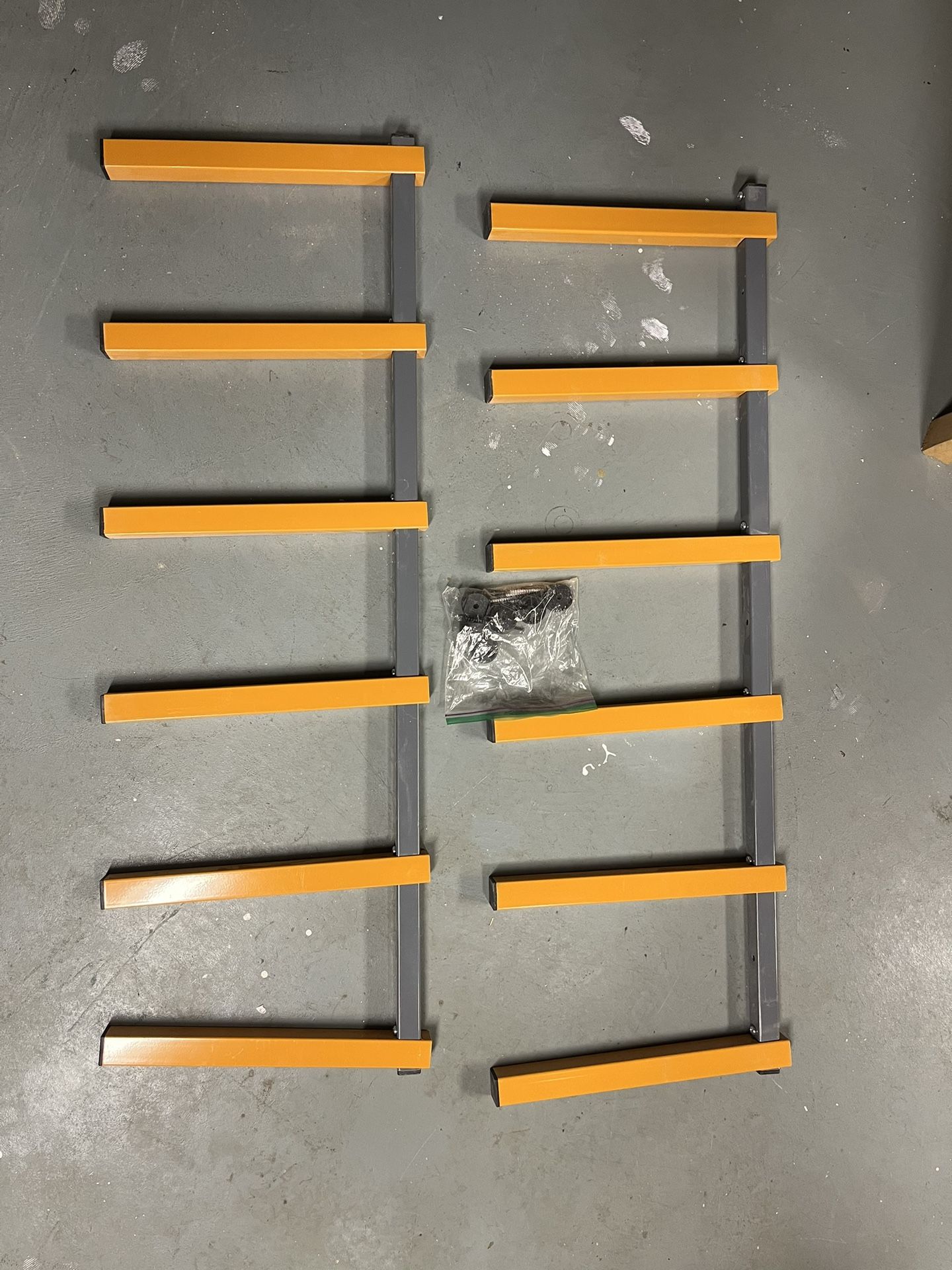 Basically brand new. No dents or scratches and in perfect shape. The racks are not bent so don’t let the picture deceive you. They sit straight when hung.