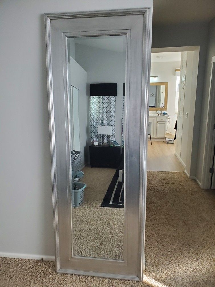 Very nice quality framed wall mirror. Silver frame. Beveled glass and 6" wide molding. 86" x 32".