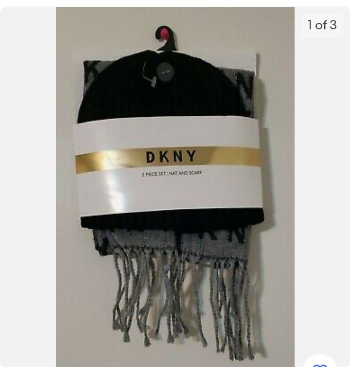 Dkny hat and scarf Winter set.gray woolen scarf with DKNY logo all over scarf and fringe both end. and black hat light weight