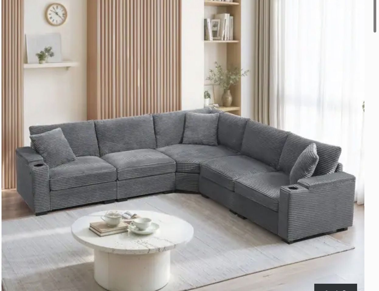 Comfy grey corduroy sectional couch. L-shaped design. Has cupholders on both ends. Storage in armrests. Modular design. Measures 106 inches by 106 inches. Height is 32.5 inches. It was purchased less than a year ago when I moved into my new home… unfortunately I’m moving again and it won’t fit into my new space! $750 OBO! I originally purchased it from Bed, Bath and Beyond for about $1,300. ZERO stains, marks, tears or deterioration on the couch! Looks and feels brandnew :)