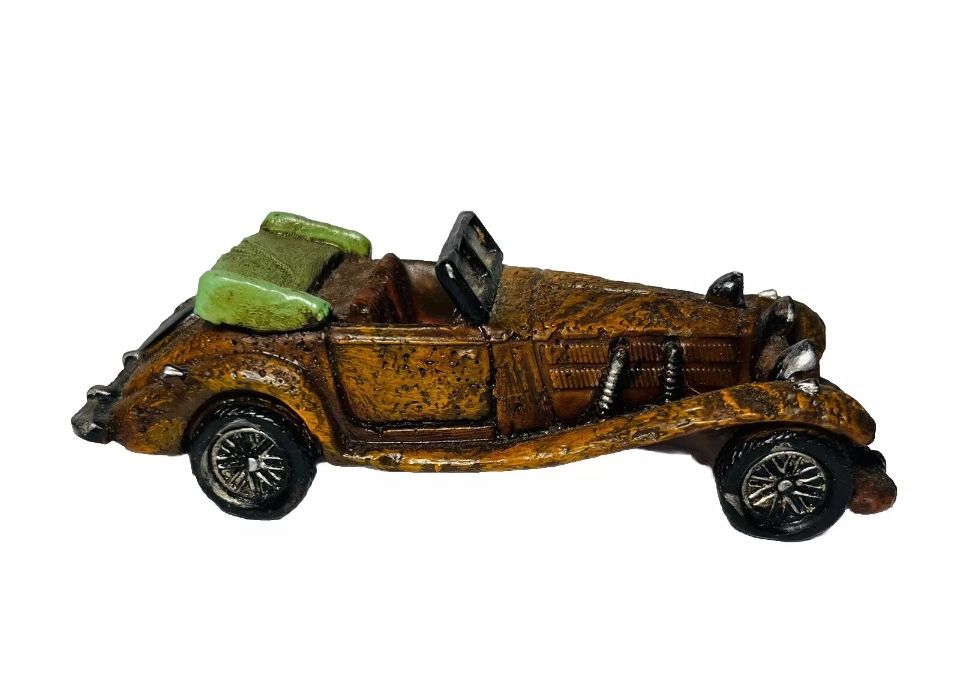 Add a vintage touch to your desk with this antique-style miniature convertible car. Crafted from carved resin, this small figurine measures 4.5 inches in length and 1.75 inches in width, making it a perfect addition to any collector's display. The brown color and intricate carvings give this piece a unique and charming appearance, while the subject of the sculpture is an automobile that is sure to delight car enthusiasts. This item weighs 4.8 oz and features a finish that adds to its overall appeal. Perfect for collectors of decorative collectibles and sculptures, this vintage replica miniature car is a must-have for anyone looking to add a touch of nostalgia to their decor.