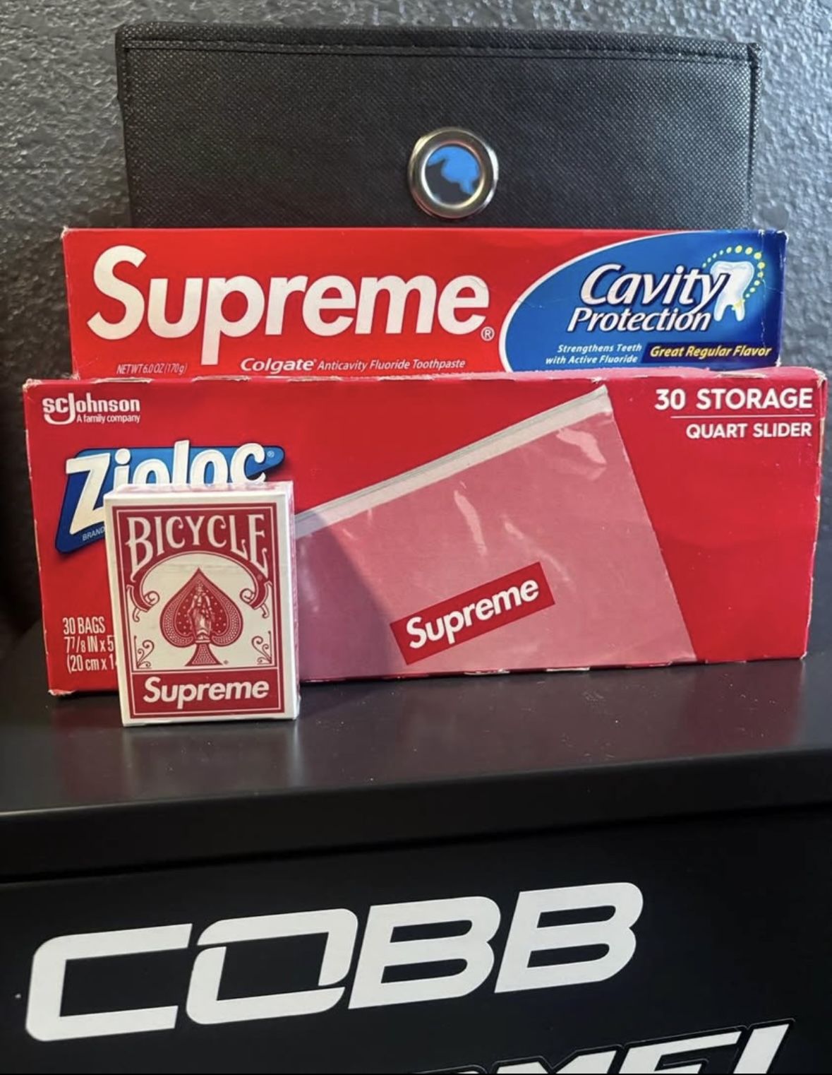 Supreme Accessories 1 Supreme Zip lock bags 1 Supreme Colgate toothpaste 1 Supreme Mini deck playing cards