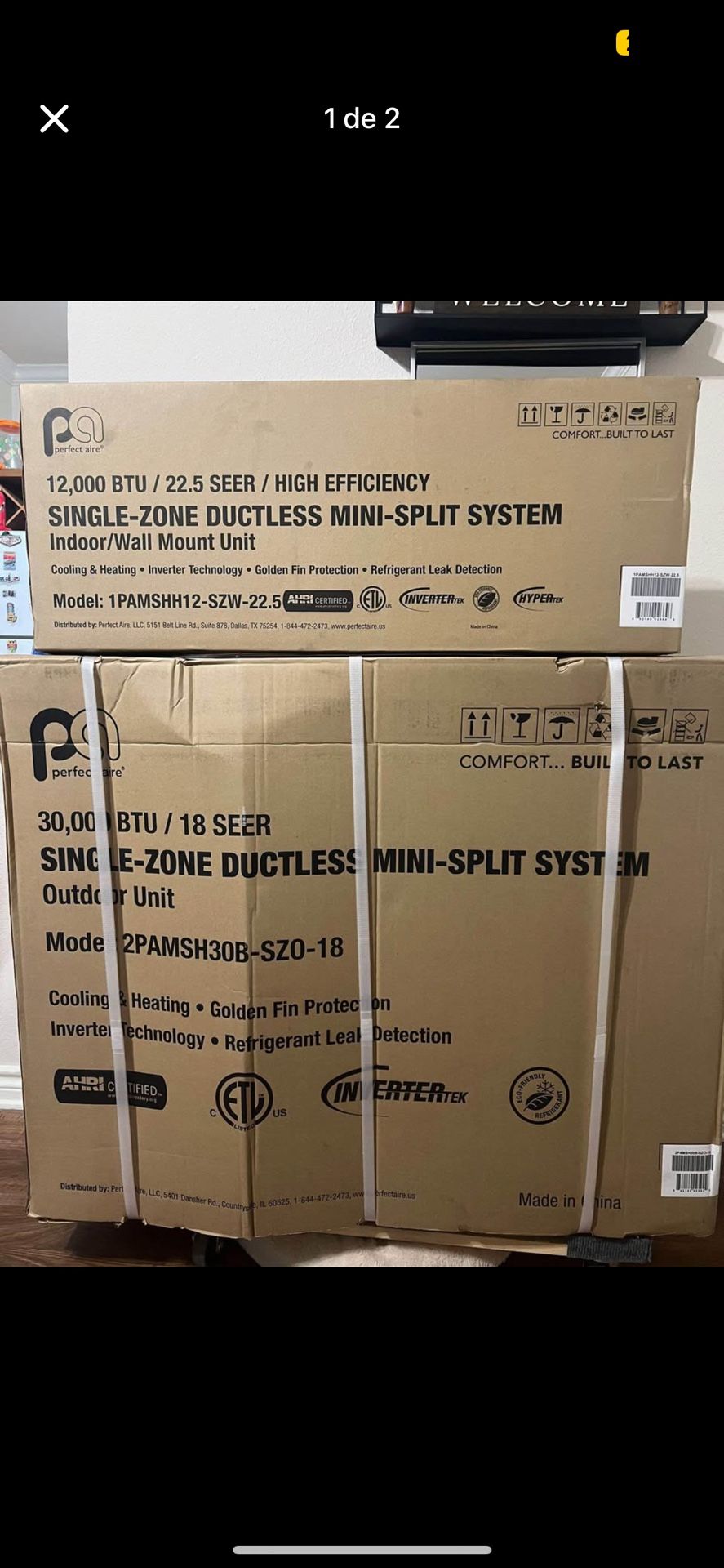 Brand new Perfect Aire ductless mini split system, never installed, still in original boxes. This is a high-efficiency inverter system with cooling and heating, perfect for homes, garages, offices, or apartments. Includes: ✔ Indoor wall unit – 12,000 BTU – 22.5 SEER ✔ Outdoor condenser – 30,000 BTU – 18 SEER ✔ Inverter technology ✔ Heating & cooling ✔ Energy efficient ✔ Refrigerant leak detection ✔ Golden Fin protection This is a complete single-zone system ready for professional installation. I’m selling it because I will not be using it. Everything is new and unopened. Serious buyers only. Cash or Zelle. Pickup in Addison / North Dallas area.