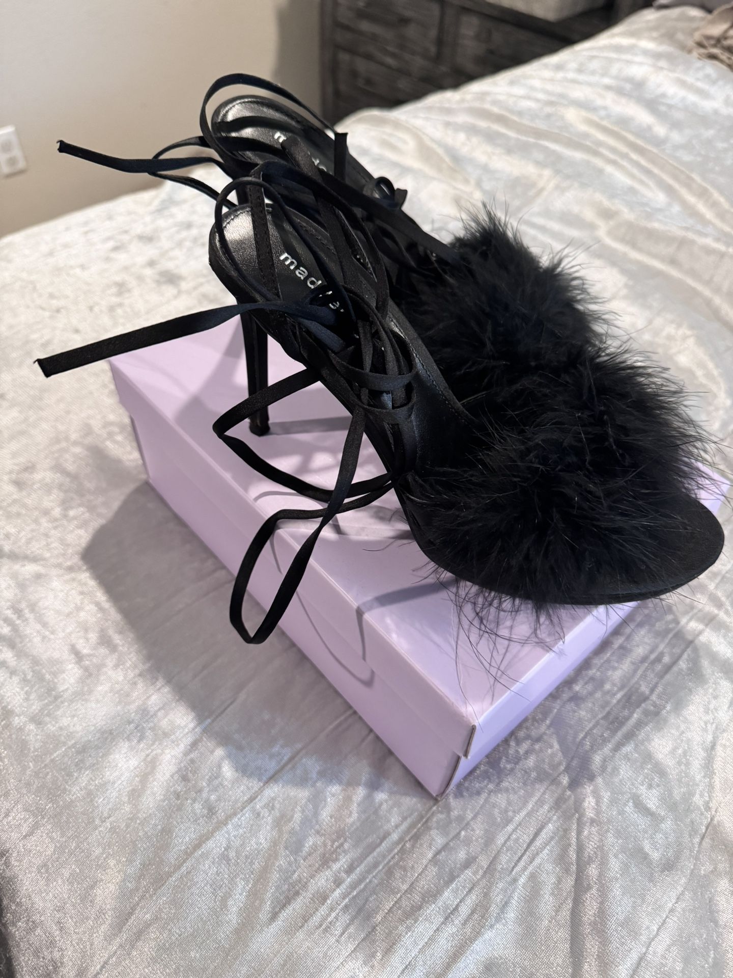 Only worn once. Must pick up. Back of the heels a little worn(see second photo) Size 9 Black satin