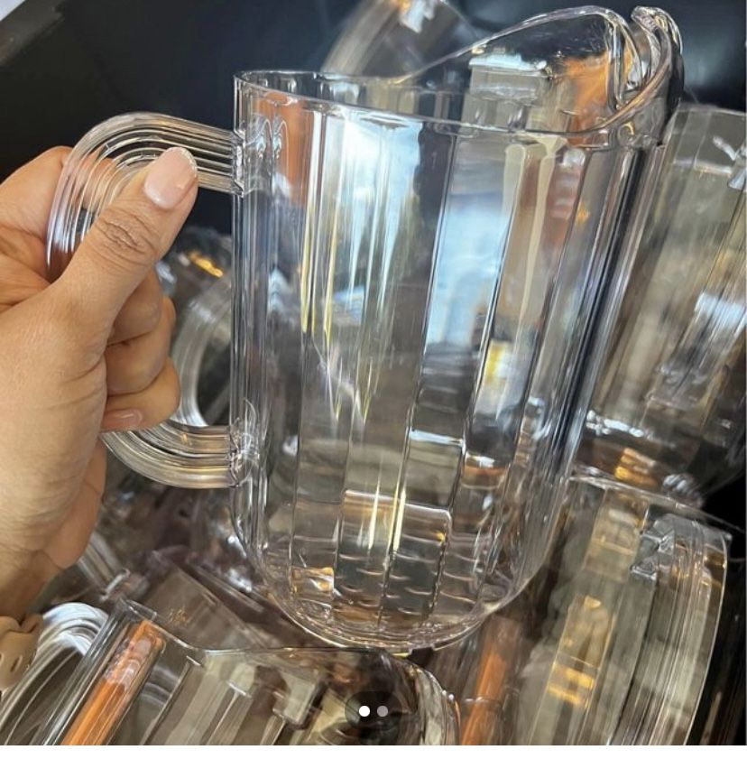 Only used once for a party. Mifoci 24 Pack 48oz Acrylic Pitcher with Spout Clear Water Carafe Bulk Fridge Jug Juice Containers with Handle for Iced Tea, Sangria, Lemonade, Juice, Milk, Coffee and Homemade Beverage