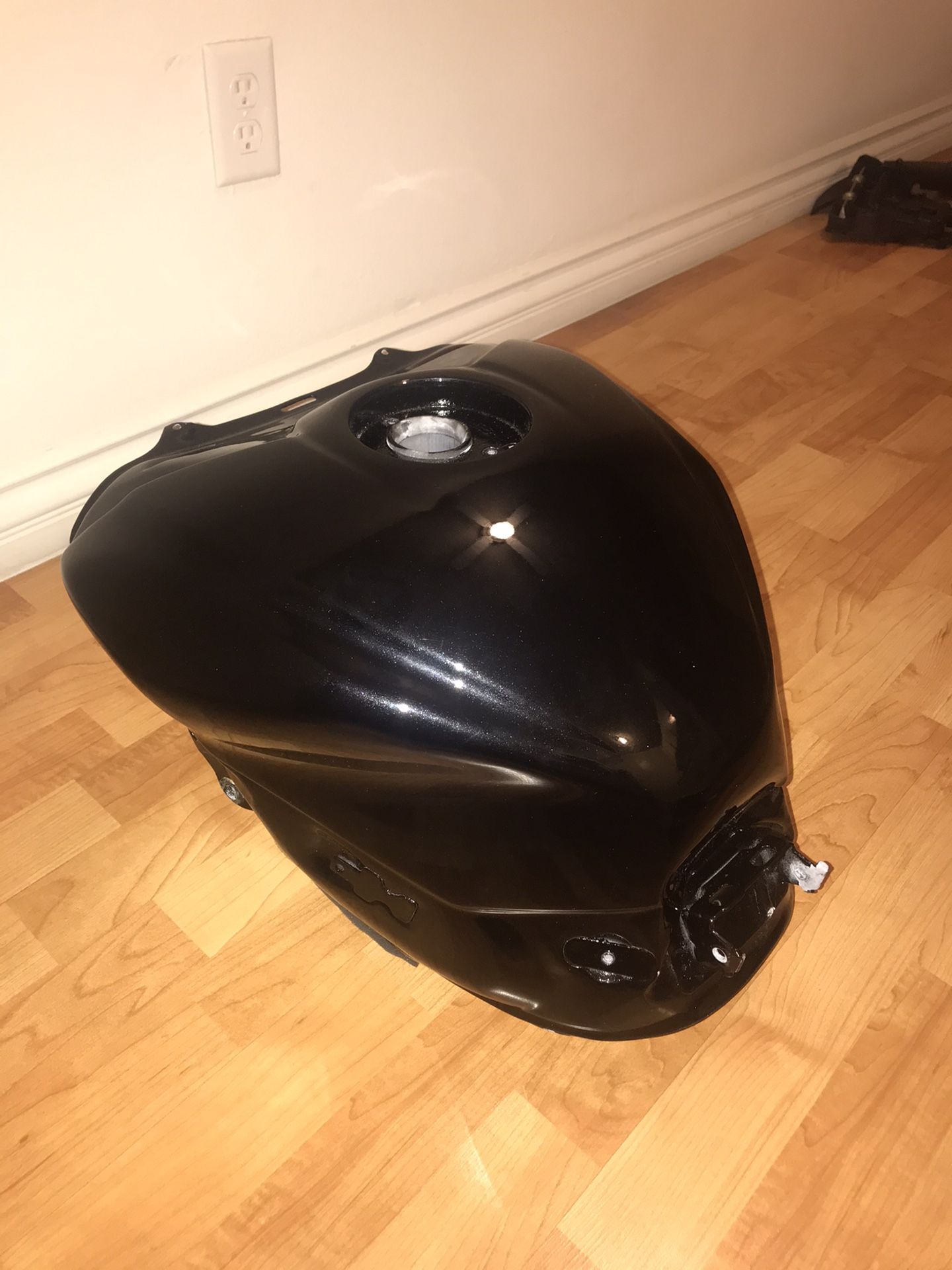 OEM Yamaha R6 2016 black fuel tank, it was blue and recently painted black. The fuel tank has a dent on the back side due to the impact. It can be fixed but I don’t have the time for that. The last 4 pictures show how deep the dent is and the inside of the tank. No rust whatsoever. It has 1000+ miles until I had the accident. Sold AS IS.