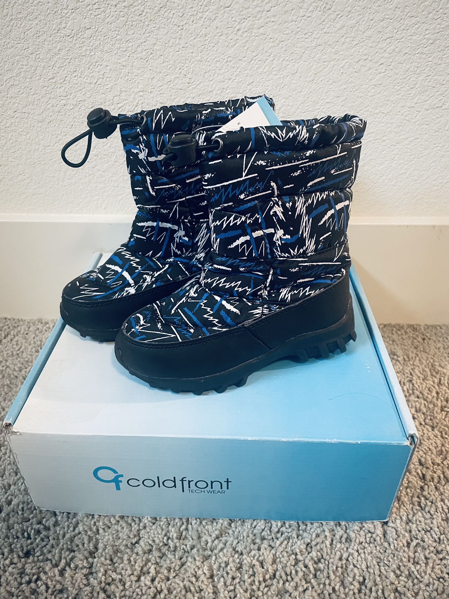 New boots, in box and with tags. Size 10, black/blue, top cinch, traction outsole. Got it for snow trip but never made it there before kid outgrew it. Pick up only.