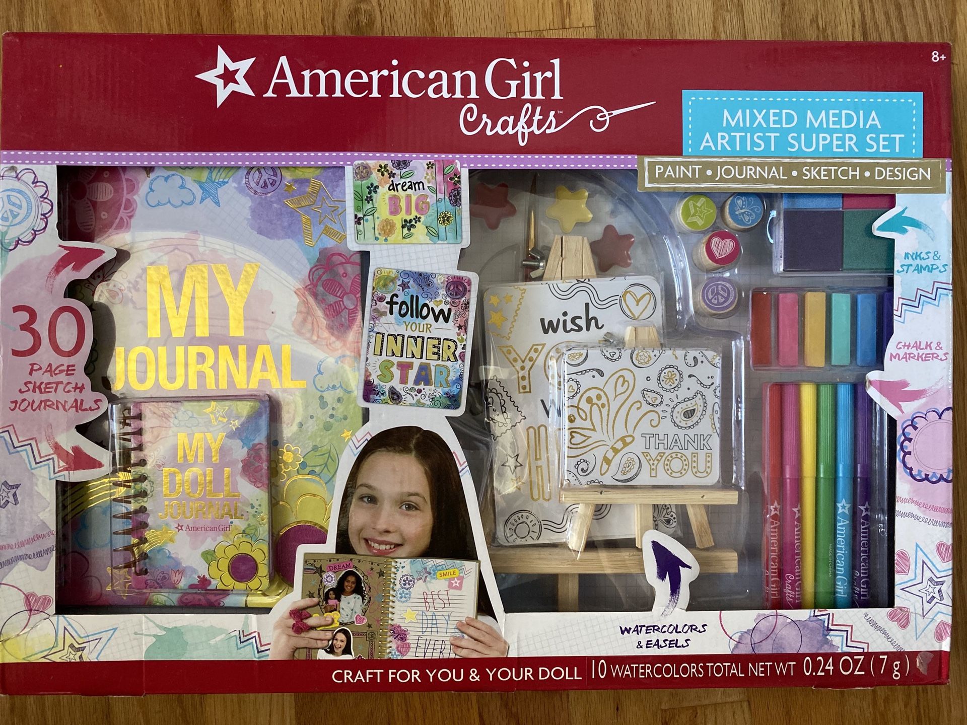 American Girl Crafts - New Unopened box set. Brand New! - Factory Sealed! American Girl Crafts - Mixed Media Artist Super Set - (Paint * Journal * Sketch * Design) Set includes: 30 Page Sketch Journal 30 Page Doll Journal 1 Bamboo Easel 1 Bamboo Doll Easel 5 Watercolor Mini-Posters 5 Watercolor Doll Posters 5 Watercolor Postcards 10 Watercolors 1 Paintbrush 4 Ink Pads 4 Stamps 6 Markers 6 Chalk Pastels 1 Sticker Sheet Note: Box shows some signs of shelf wear, but tape seals are intact, and have not been broken.