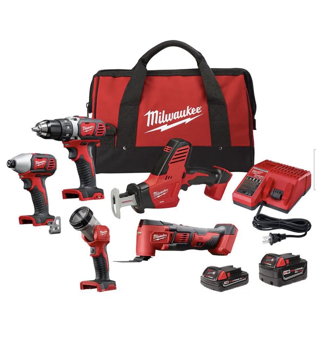 Milwaukee 5 tool kit with two batteries, charger and tool bag