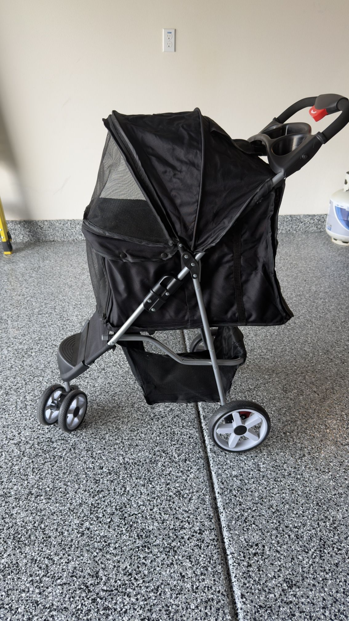 Lightweight pet stroller in excellent condition, perfect for small dogs or cats. Features breathable mesh windows, secure zipper enclosure, smooth-rolling wheels, cup holders, and storage basket. Easy to push, folds for transport, and ideal for walks, vet visits, or travel. Clean and ready to use.