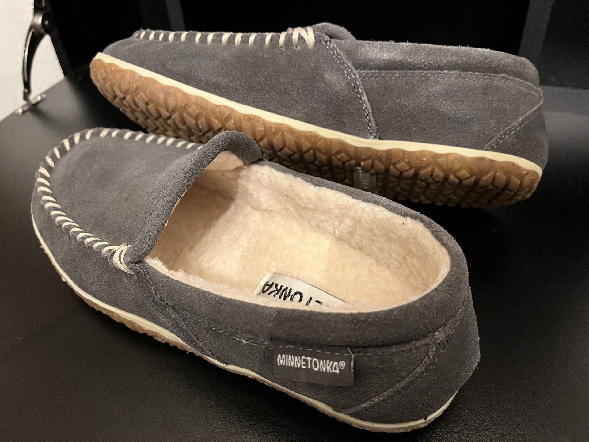 MOCCASIN SLIPPERS *** NEVER BEEN WORN *** SIZE: 7M ( MEN’S ) COLOR: GREY SELLING PRICE: $25.00