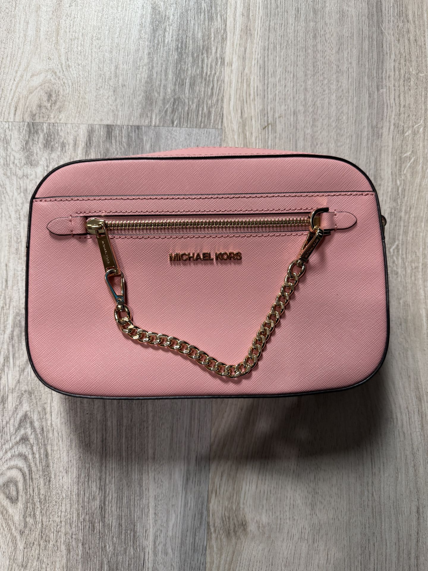 Pink Michael Kors Jet Set Large Saffiano Leather Crossbody Bag featuring gold-tone hardware and a chain-link zipper pull. Lightly used